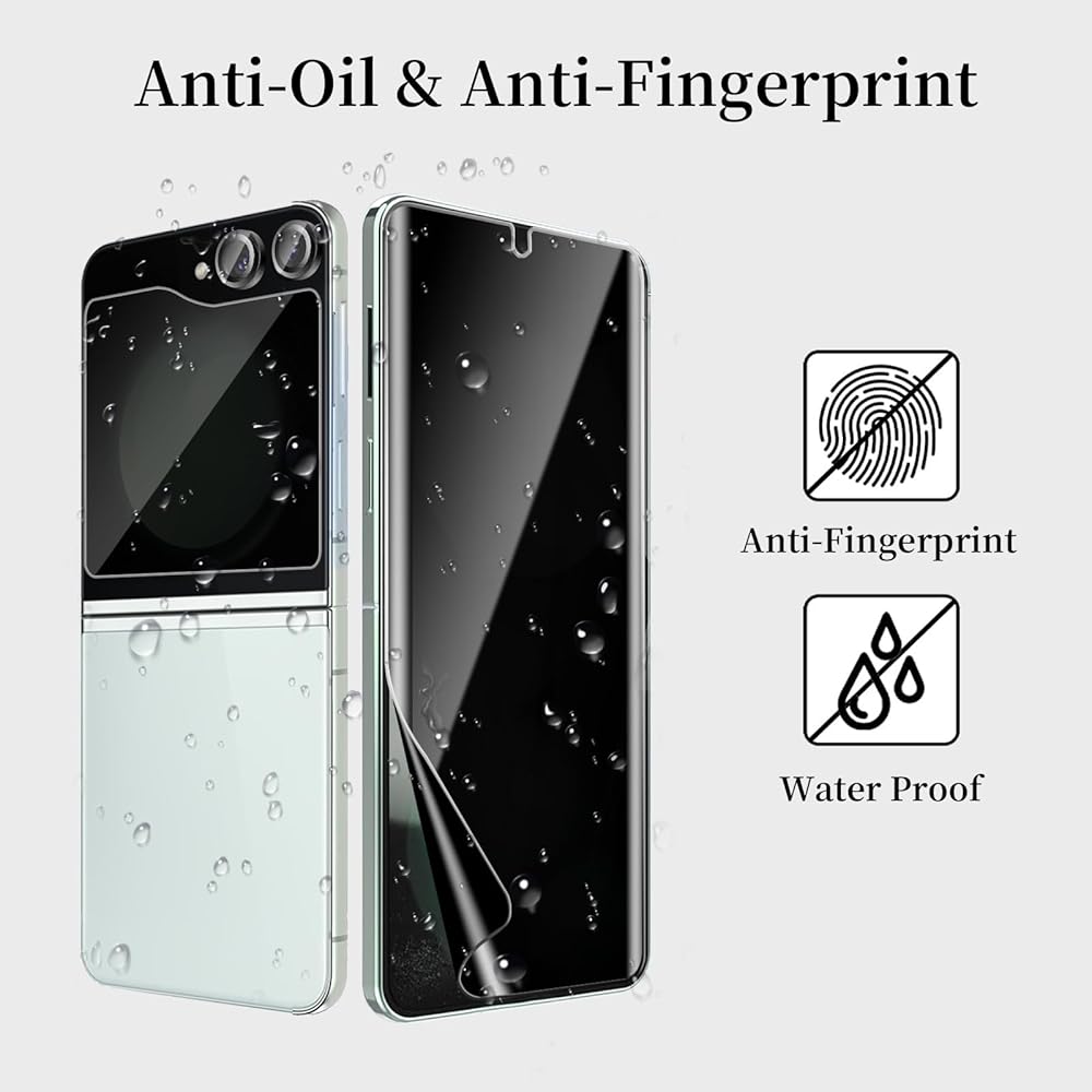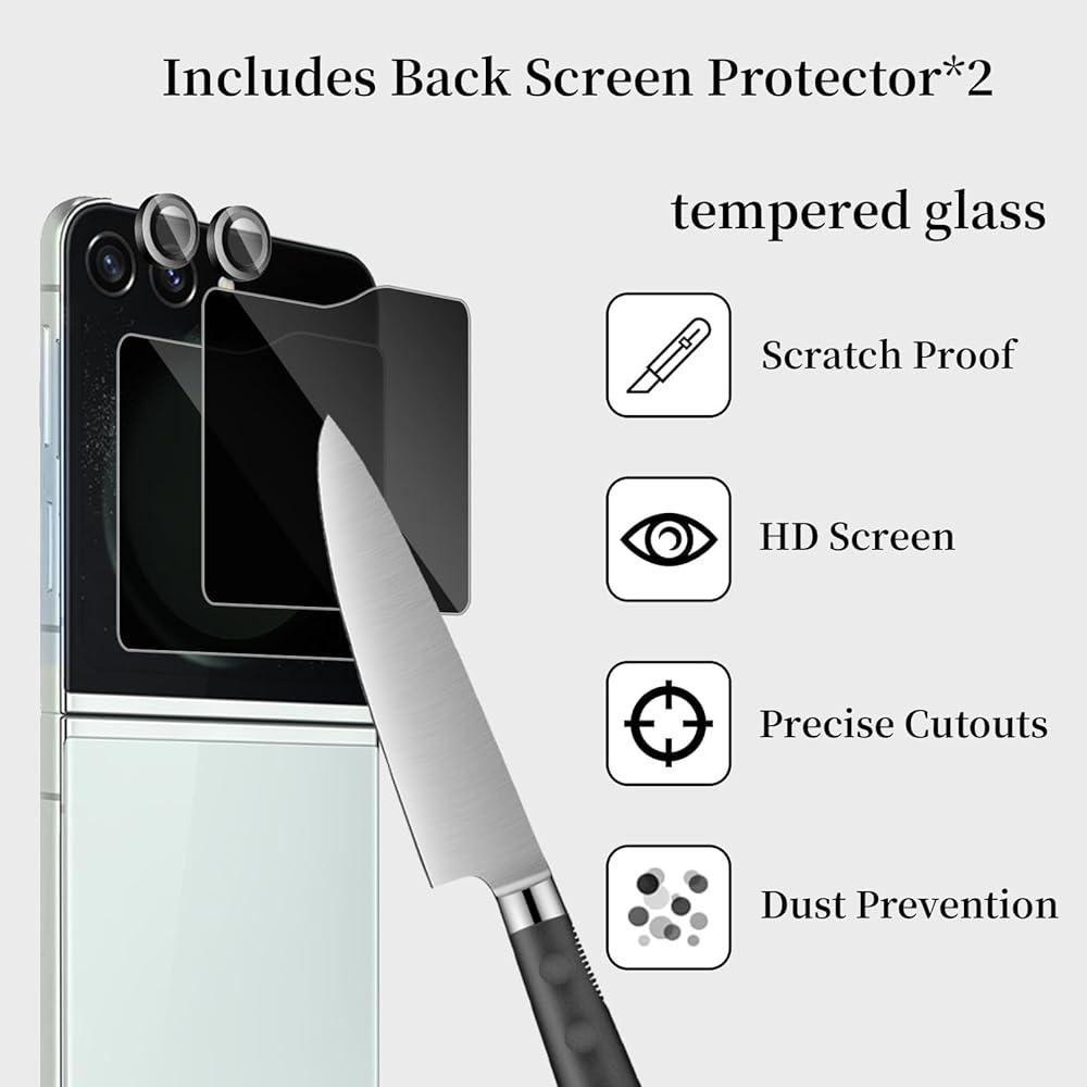 【Package Include】2 Pack Internal Anti-Spy Film + 2 Pack Outer Privacy Glass Screen Protector + 2 PCS Metal Camera Lens Protector are specifically designed for Samsung Galaxy Z Flip 6 5G.