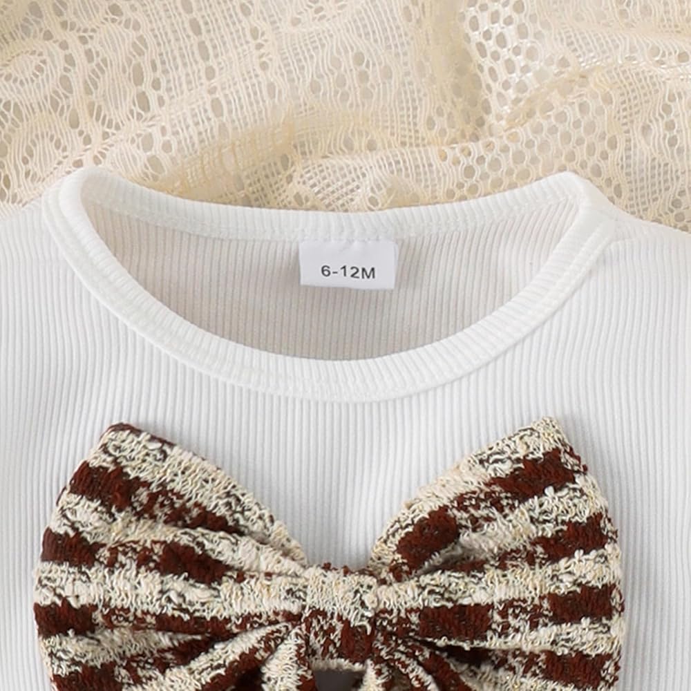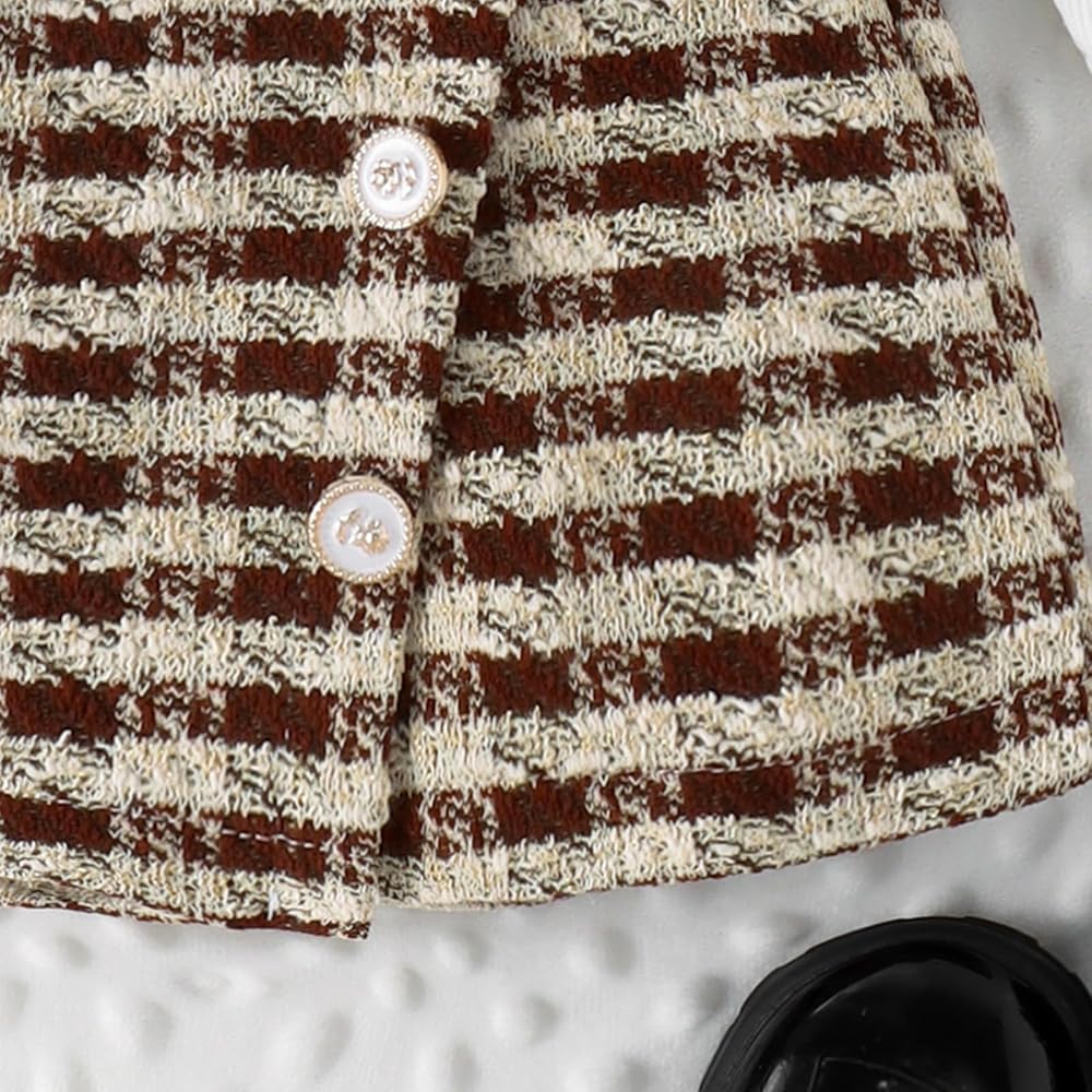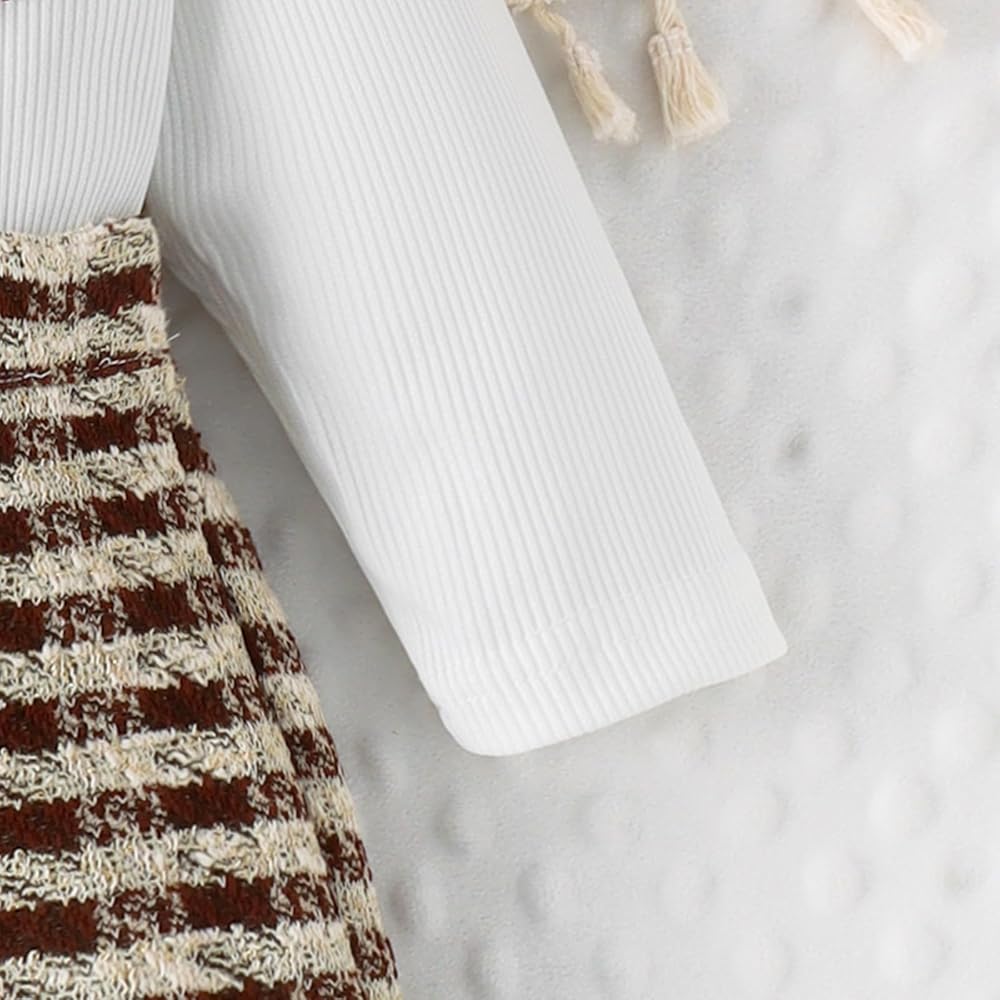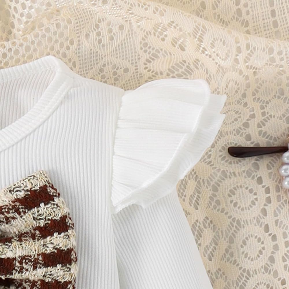 Design:Baby girls spring autumn outfits, flying sleeve,long sleeve, round neck, solid color, casual ribbed tops, a-line style, plaid skirt, very sweet and adorable.Girl's short skirt set, can be paired with cute headbands or hats, sneakers, casual shoes, sandals, or boots to create a fashionable look