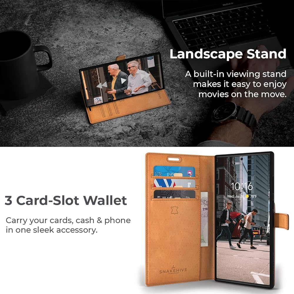 DROP, CAMERA & SCRATCH PROTECTION: At Snakehive we value your phone as much as you do. That's why our Vintage Samsung Galaxy S22 Ultra leather case features a leather outer lip and flexible inner providing extra protection for your Phone. Our Samsung Galaxy S22 Ultra leather wallet also features a uniquely designed, raised phone casing, which protects your camera lens from damage or scratches