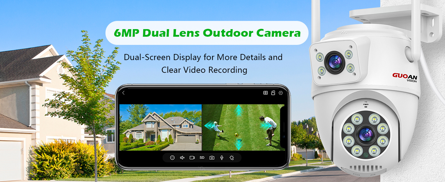 【Dual Lens 360° View & Waterproof 】 GUOANVISION security camera wireless outdoor displays 2 screen on phone simultaniously, one shows wider panoramic monitoring and another shows pan 360°/Tilt 90° rotation and zoom. IP66 waterproof outdoor cameras is use for extreme weather conditions of outside, guarding your home in all seasons. "Wireless" means wireless wifi connect or NVR, Not 100% Free cord.
