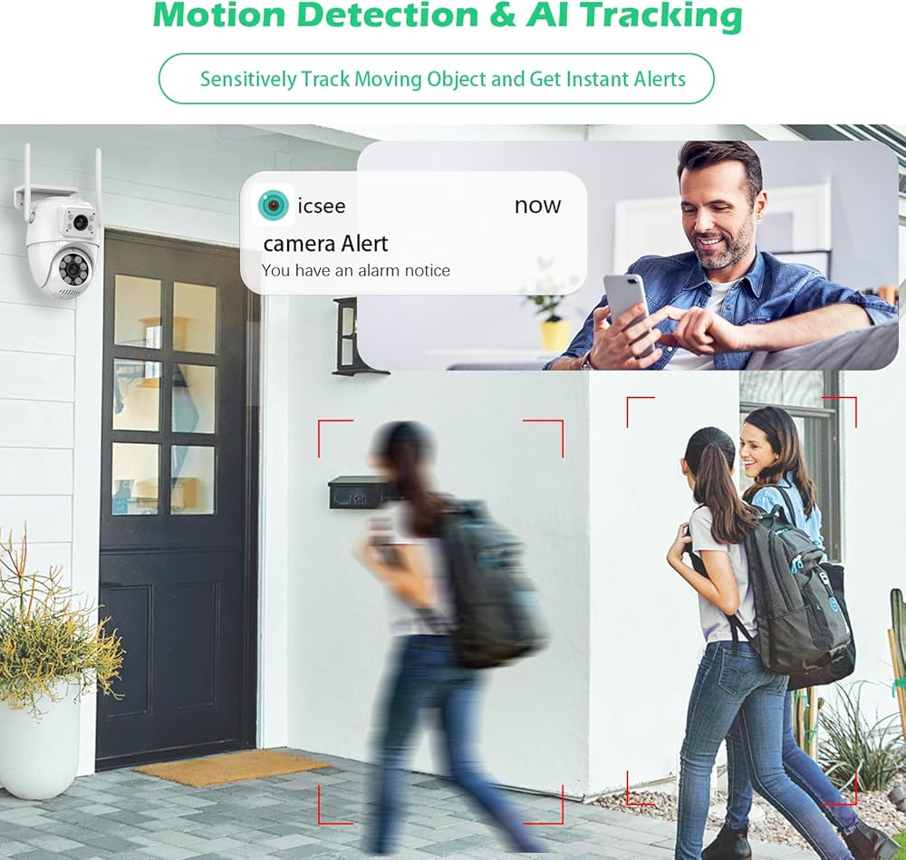 【6MP HD Night Vision &AI Detection and Tracking】Our outside camera for home security delivery crystal-clear dual 3MP HD full color and infrared night vision. The outside camera equipped with Spotlight features, the images remain vividly visible even during the darkest nights. The enhanced AI algorithm of the security camera system ensures smart motion detection, sound & light alarm, and humanized recognition, minimizing false alarms, the outdoor camera wireless makes you peace of mind.