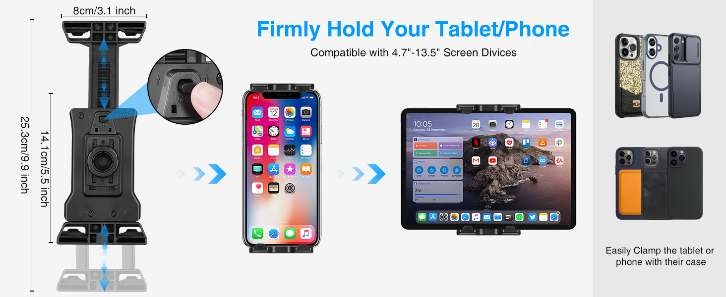 [Outstanding Compatibility]: This clamp is suitable for devices with screen sizes ranging from 4.7 to 13.5 inches, compatible with iPad Pro, iPad Air, iPad Mini, Surface Pro, Galaxy Tab, iPhone 15 series, iPhone 13 series, iPhone 14 series, iPhone 15 series as well as Galaxy S9, S8, S7 Edge and other tablets or cell phones that meet the specified size requirements.