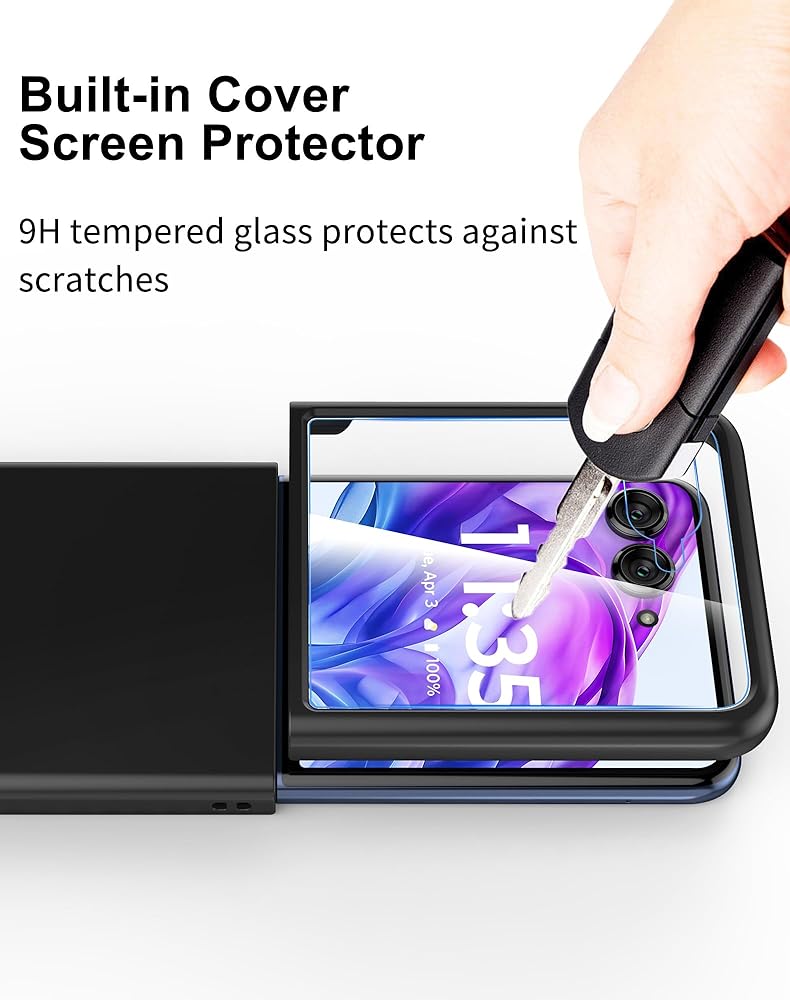 - Built-in tempered glass screen protector protects the external display.