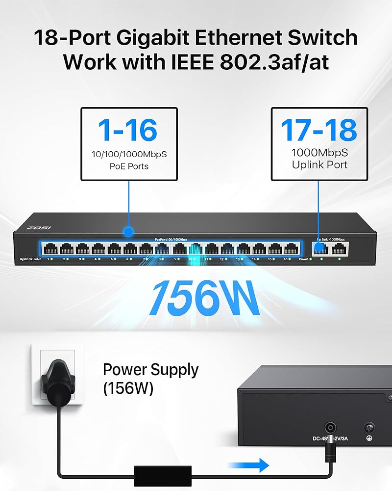 16 Port Gigabit PoE Switch: The 18-port unmanaged network switch features 16 PoE+ (802.3at/af) 10/100/1000 Mbps RJ45 ports and 2 Gigabit Ethernet uplink ports, providing a reliable and efficient network connection for your devices. 16 PoE+ ports providing up to 30W per port, total PoE power budget 156W(external power supply included)