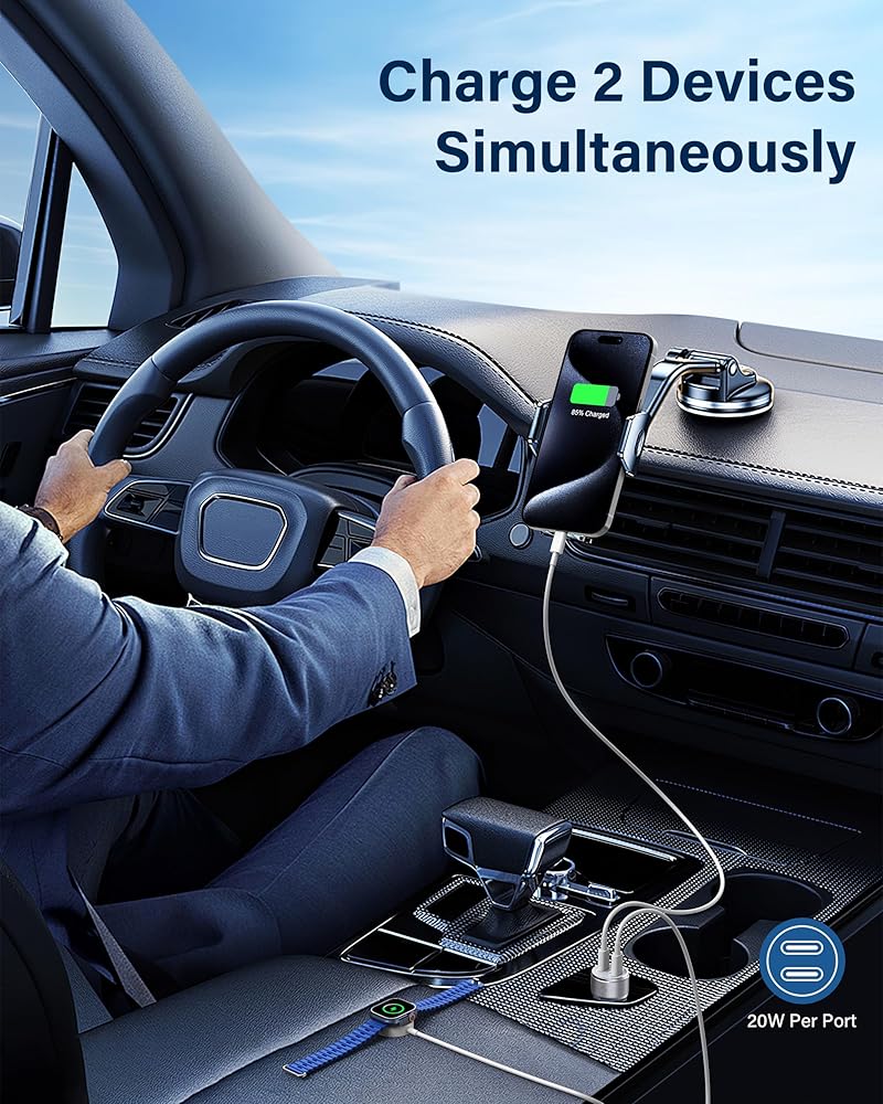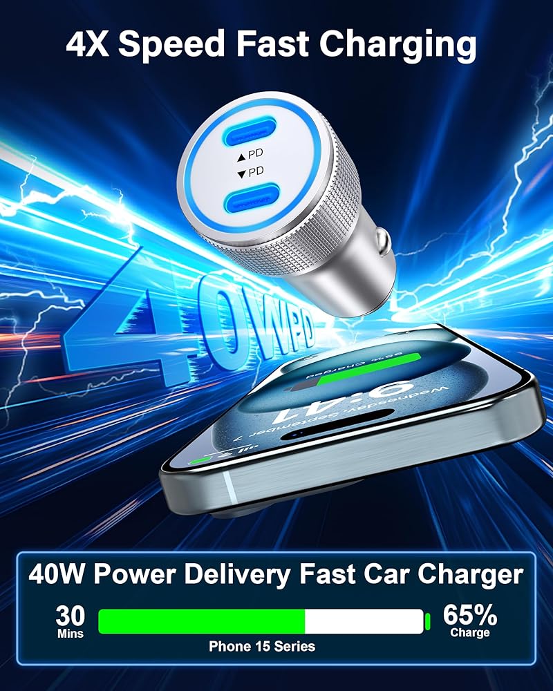 【40W Dual Ports Fast Charging】The 40W USB C fast car charger power cigarette lighter adapter is equipped with dual USB C Power Delievery 3.0 PPS fast charging ports, with USB-C to C Cable fast charging for iPhone 16 15 from 0 % to 60 % in just 30 mins. with Magnetic Charging Cable provides the fast charging speed for iWatch series Ultra / SE 2 / SE 1 / 10 / 9 / 8 / 7 / 6 / 5 / 4 in 2.5 hours.