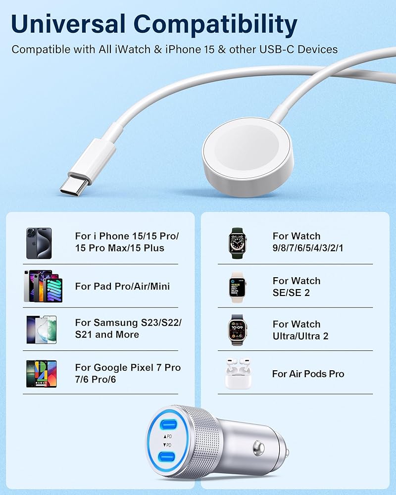 【What You Get】 1-Pack 40W All Metal Dual Port USB C Car Charger Adapter, 1-Pack 3FT USB-C to USB-C Cable, 1-Pack 3FT Magnetic Watch Charger Cable, Please feel free to contact us if you have any questions, we will provide you with a solution within 24 hours.