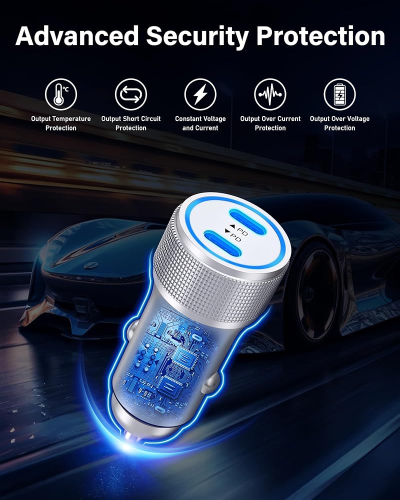 【Safe & Reliable】The full aluminium alloy body is scratch-resistant, sturdy, and attractive, effectively improving the charging efficiency by about 15% compared to plastic car chargers. Built-in advanced chips with over-current, over-voltage, short-circuit, and over-temperature protection to provide you with a safe charging experience.