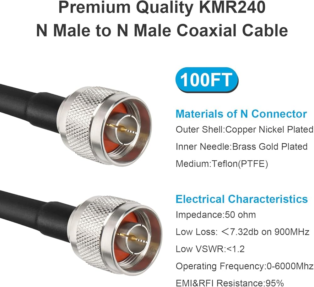 Ultra Low - loss N Male Cable - It is ideal with an 50-Ohm impedance and work for any 50 Ohm RF system. The signal loss of this n-male to male cable is less than 1.26db on 1800MHz. Swr is less than 1.15. It could support better signal transfer with minimum signal loss over large distances and higher frequency use. This KMR240 N cable is LMR240 equivalent (if you're familiar with those).