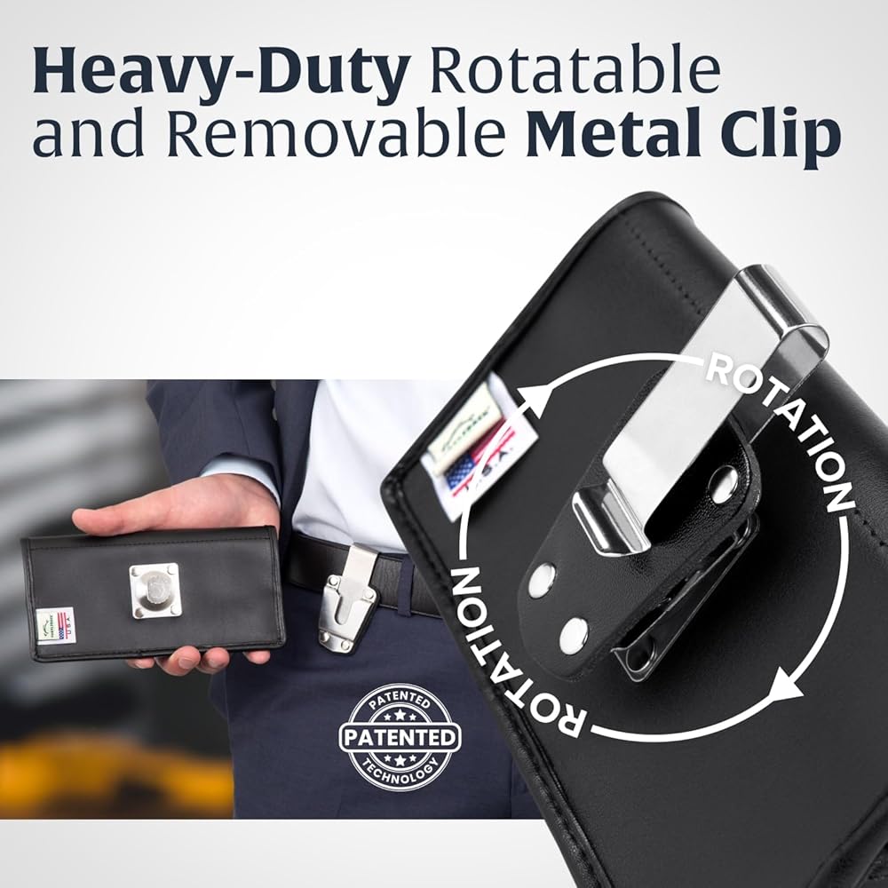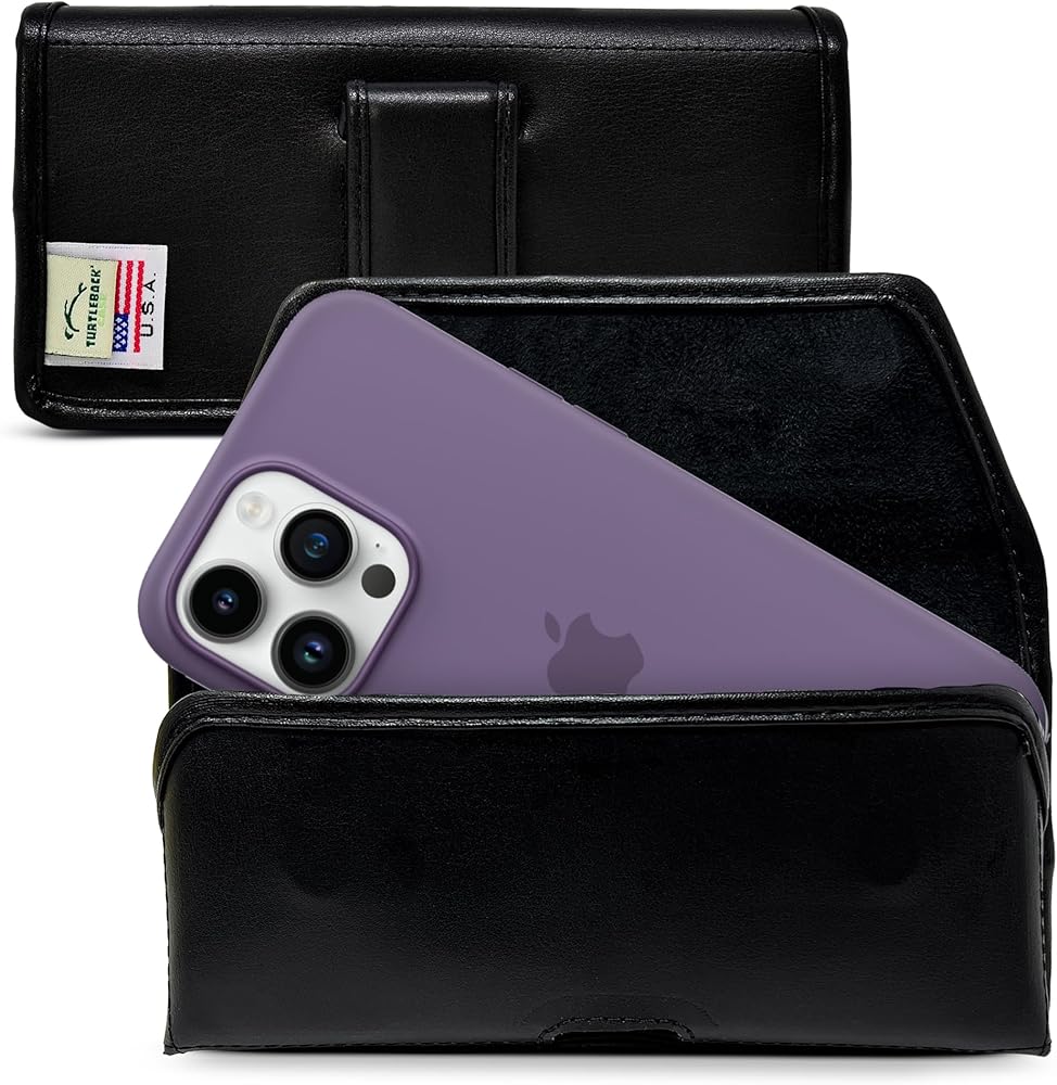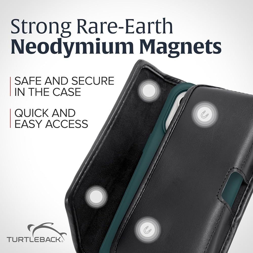 Experience premium quality and functionality with Turtleback leather cell phone case. Made from high-grade bonded leather, it perfectly combines style, comfort, and durability. A heavy-duty clip-on phone holder for pants ensures secure and convenient access to your device. Specifically designed for iPhone 16 Pro Max, 15 Pro Max, 14, 13, 12 Pro Max, this belt phone pouch accommodates phones with no cases or very slim cases, offering protection and vertical access. A soft felt interior inside this iPhone belt holder, guarantees scratch-free phone retrieval and gentle cushioning, maintaining your device's perfect condition over time. Secured by a strong rare-earth neodymium magnet flap closure, your phone stays stable and safe even during movement. Our iPhone belt holster is the perfect hands-free solution for outdoor activities like hiking, camping, biking, jogging, or traveling. It is ideal for professionals requiring frequent on-the-go phone access, such as construction workers, delivery services, policemen, and businessmen.