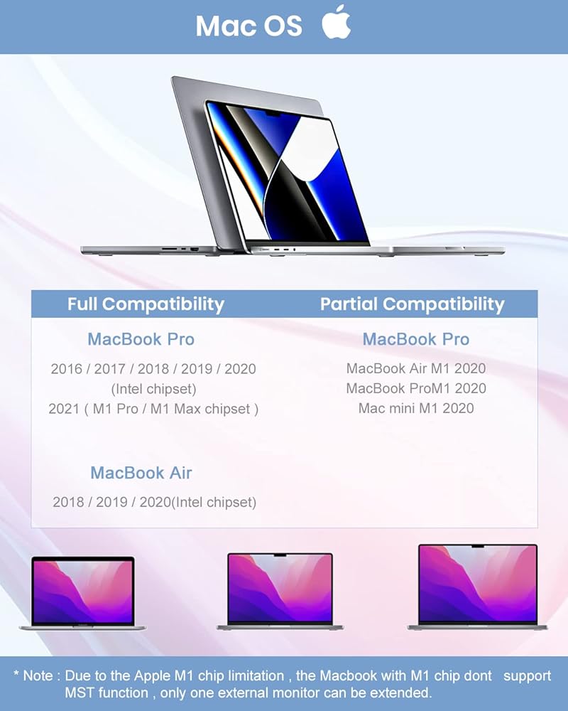 Compatibility: Specifically designed for MacBook Pro/Air, plug and play, no driver required. Incompatible with Windows and MacBook with M1 chip. Tiergrade 16 in 2 docking station is compatible with MacBook Pro 2016/2017/2018/2019/2020 (Not M1), MacBook Pro 2021 M1 Pro/M1 Max, MacBook Air 2018/2019/2020 (Not M1). Note: Due to the Apple M1 chip limitation, MacOS with an M1 chip only can extend one external display.