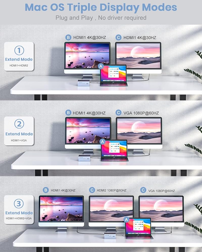 Triple Display with Dual 4K HDMI: Tiergrade USB C docking station is equipped with dual 4K HDMI extended displays and supports triple display on MacBook (HDMI 1+HDMI 2+laptop). HDMI ports support resolutions up to 3840x2160@30Hz, and VGA port supports resolutions up to 1920x1080@60Hz. *Note: When using the extended mode, HDMI 1 and HDMI 2 and Macbook can triple display different images, but HDMI 2 and VGA always display the same image.