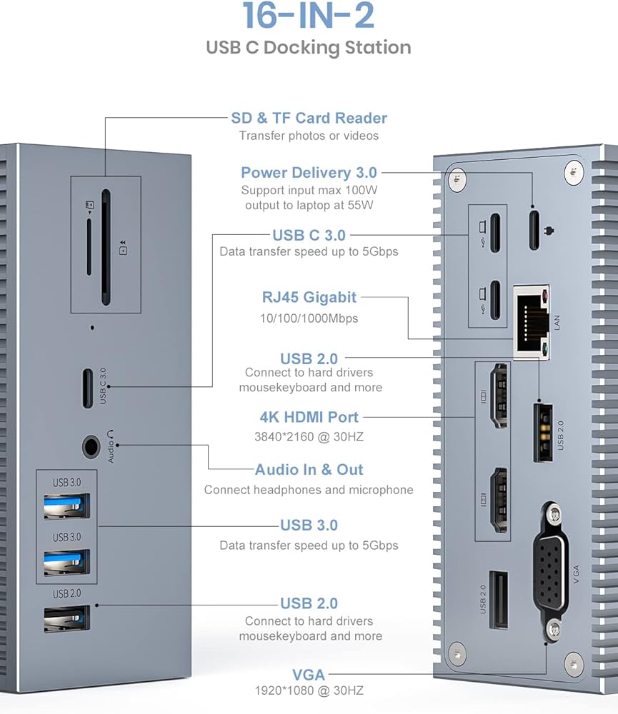 Tiergrade 16 in 2 Macbook Docking Station:Dual 4K HDMI, one VGA, 55W PD, USB C 3.0, 2 USB 3.0, 3 USB 2.0, Gigabit Ethernet, 2 USB C host, SD/TF card reader, 3.5mm Audio/Mic 2-in-1. Our worry-free warranty service covers your product. If you have any questions about the product, please get in touch with us.