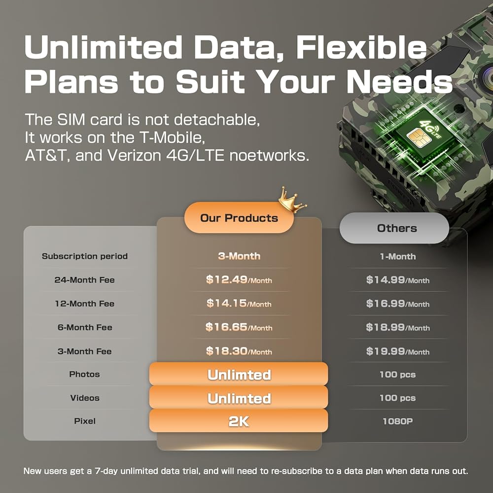Trail Camera Unlimited Data Plan 2K Live Video Cellular Trail Camera Built in 4G SIM Card Game Camera, Unlimited Photos & Video Transmission Trail Cameras with Night Vision Motion Activated