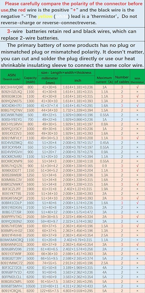 Please carefully compare the polarity of the connector before use,★the red wire is the positive "+" and the black wire is the negative "-"White wire is thermistor "NTC",Do not reverse-charge or reverse-connectreverse. ★The primary battery of some products has no plug or mismatched plug or mismatched polarity. It doesn't matter, you can cut and solder the plug directly or use our heat shrinkable insulating sleeve to connect the same color wire.