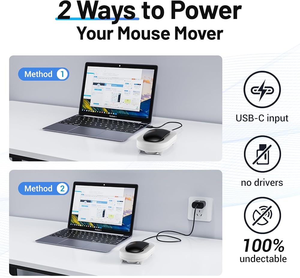 USB & 100% UNDETECTABLE: Our mouse mover use a standard USB, and can be plugged in directly to your computer or an electric outlet if you have an adapter. There is no advanced logic, nothing to program or configure