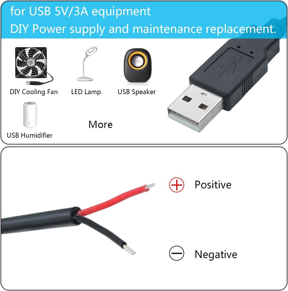 【DIY 2Pin Bare Wire】Short USB 2.0 power cable has one end of USB 2.0 male socket and the other end of 2 pin bare wire.Used for USB 5V/3A equipment DIY power supply and maintenance replacement.