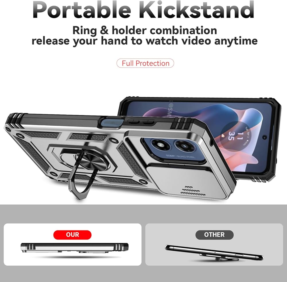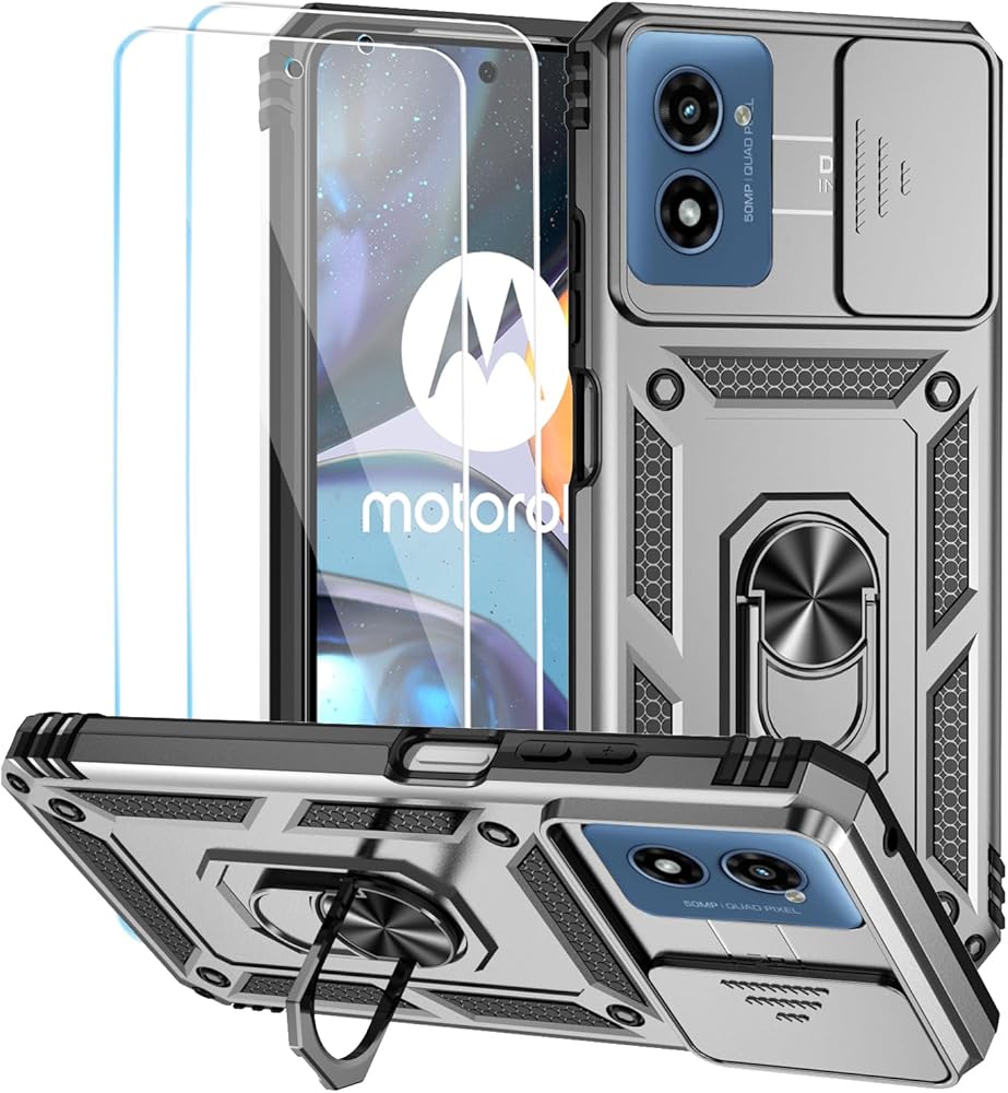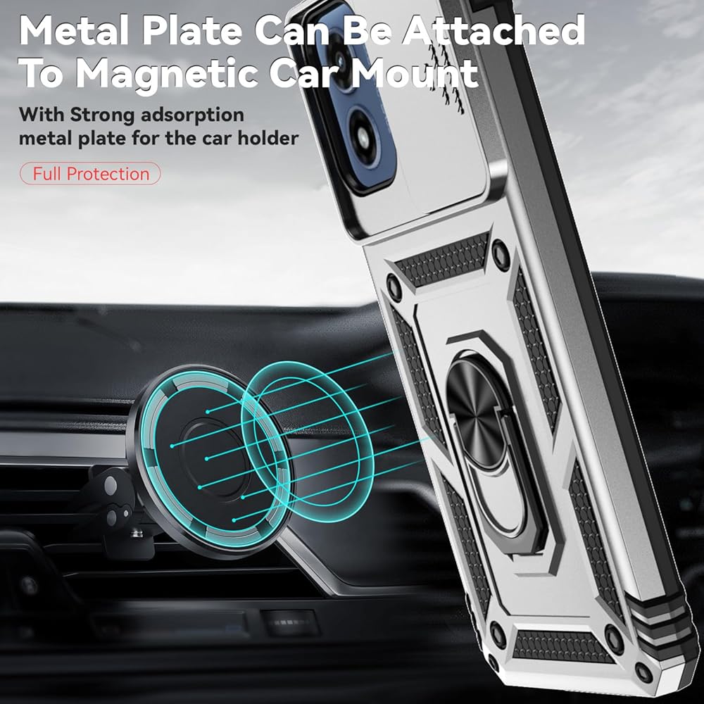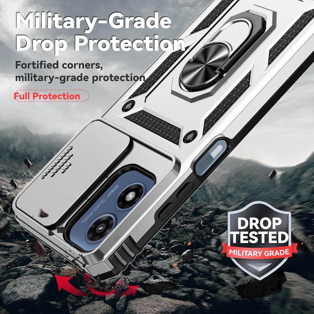Compatible with Motorola Moto G Play 2024 Case with HD Screen Protector & Slide Camera Cover & Rotated Ring Kickstand,Heavy Duty Shockproof Phone Case for Moto G Play 2024 4G (Silver)