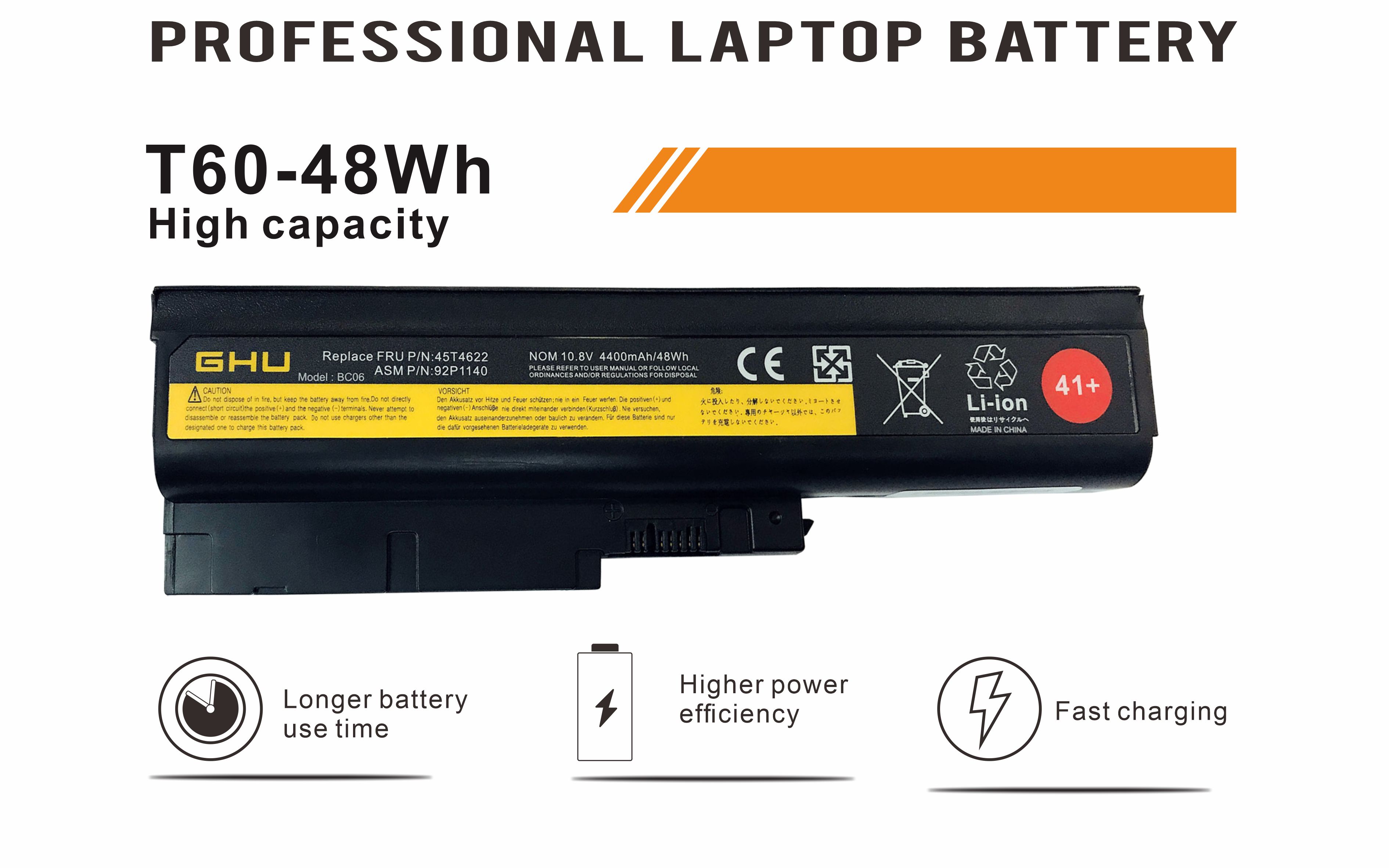 New GHU Battery 48 Wh Replacement Compatible With Lenovo ThinkPad T60 T500 W500 R60 40Y6799 40Y6797 92P1141 92P1133 92P1137 92P1138 42T4511 42T4504 42T4622 42T5232 43R9252. GHU T60 battery is fully compatible with t500 battery, w500 battery, and sl400 battery;