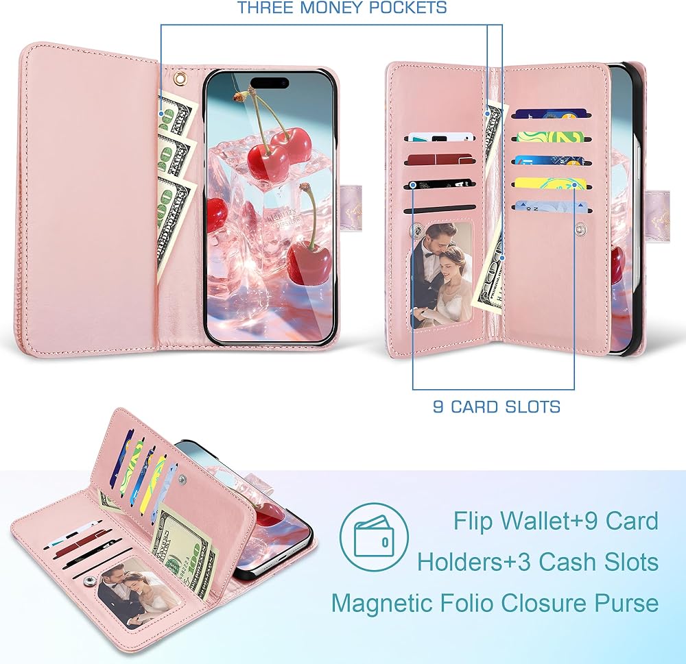Fingic for iPhone 16 Pro Case Wallet Case for Women Girl[with 9 Card Holder]Marble Rose Gold PU Leather Detachable Wrist Strap Full Body Slim Shockproof Flip Phone Case for iPhone 16 Pro,6.3 inch,2024
