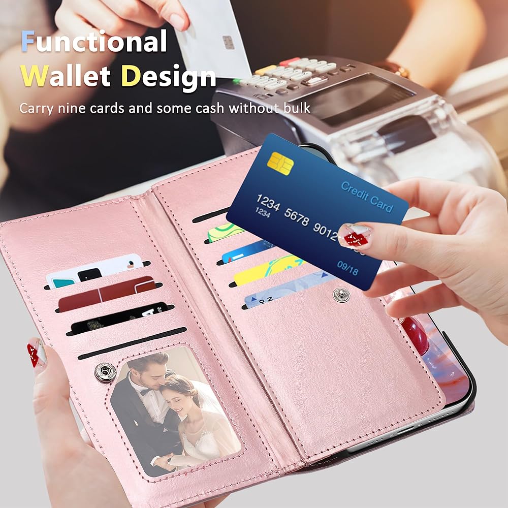 【9 Card Slots & Detachable Wrist Strap】 Inside features 9 card slots,one ID window and 3 bill compartments;Wrist strap is convenient to take your phone to anywhere