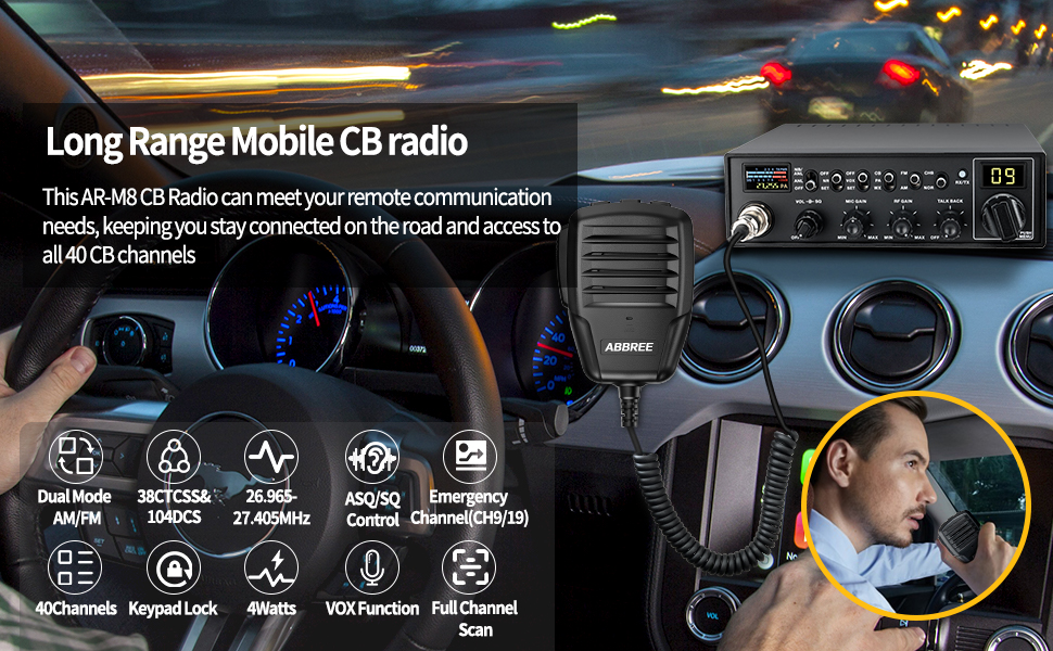 Professional CB Radio-Meet All You Need,4Watts Output,AM/FM Dual Mode,Full 40-Channels Operation,NOAA Weather Channels,SWR High Alert,Support PA System,26.965-27.405MHz frequency range,Color Backlit LCD Display,VOX Function,Noise Reduction,Keypad Lock,Full Channel Scan,Emergency Radio,RF Gain Control.FCC ID:2BDQ3AR-M8
