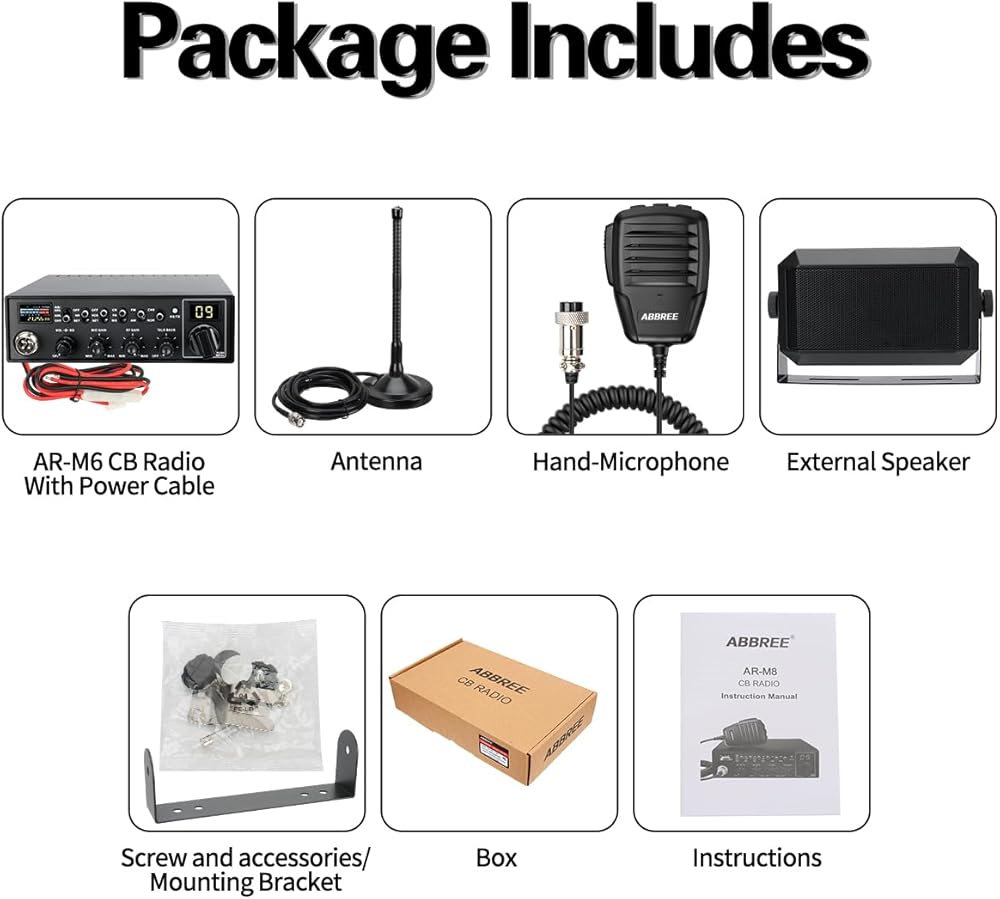 Package Include:1XCB Radio;1XMagnetic Mount Antenna;1XExternal Speaker;1XSpeaker Mic;1XScrew and accessories/Mounting Bracket;1XManual
