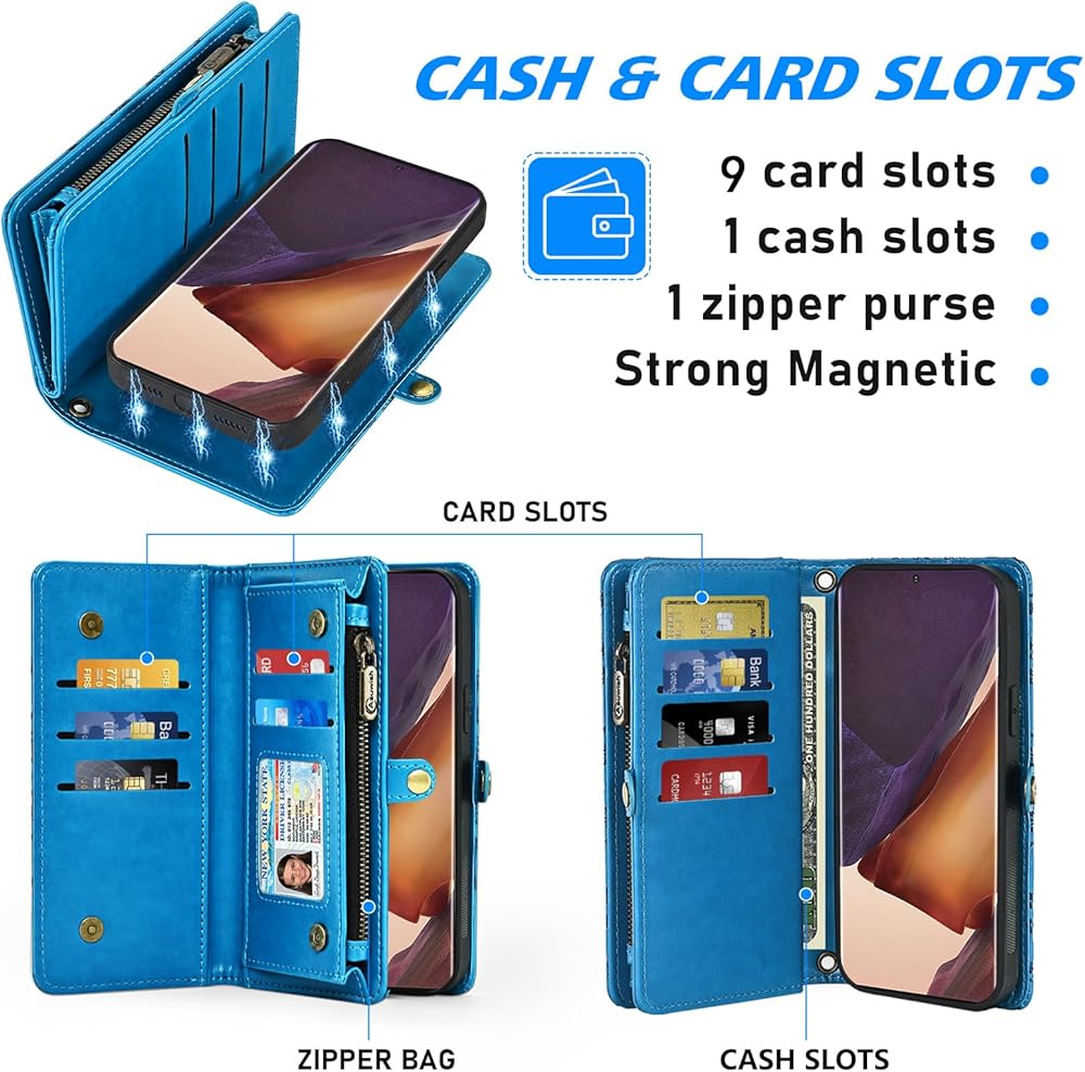 【Card Slots & Zipper】: This case includes 9 card slots + 1 cash slots + 1 zipper bag, hold your ID,credit cards,driver license,bills,coins,key and a little bit cash without problems.