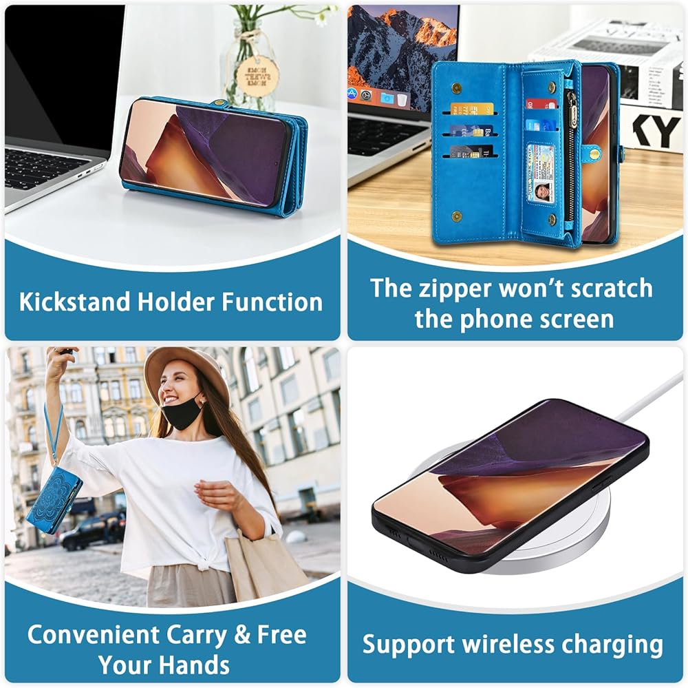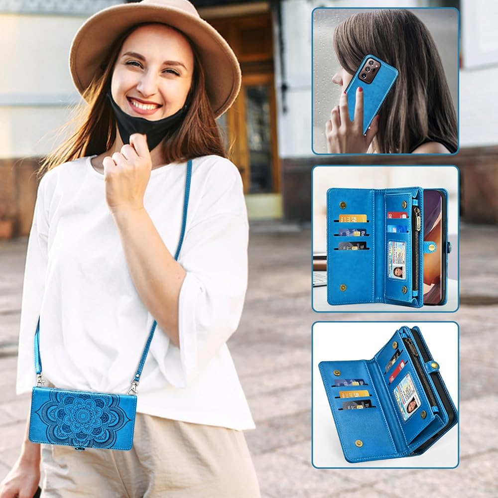 Asuwish Phone Case for Samsung Galaxy Note 20 Ultra 5G Zipper Wallet Cell Cover with Screen Protector Strap Flower Card Holder Note20 Plus Notes 20Ultra Note20+ U + 20+ Twenty Not S20 Women Girls Blue