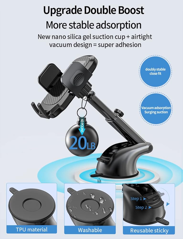 [2022 Upgraded Car Phone Holder] 158 kinds of materials Optimized for 118 models, we have Improve it to a better version. This is 20 times stronger than normal. It also has a double lock feature An extra secure grip mechanism. rinse pad Warm water and air dry for reuse. sucker Withstands temperatures from -4°F(-20°c) to 194°F °F (90°C)! The cold in Alaska also works well.