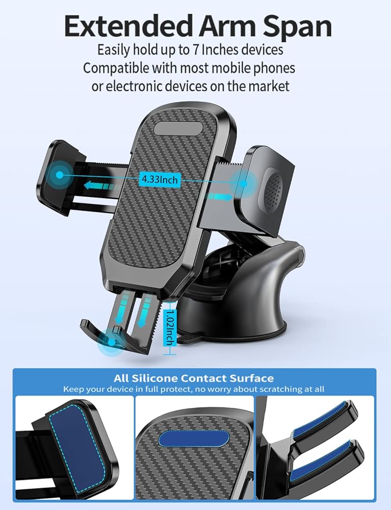 Car Phone Holder Universal Hands Free Suction Phone Holder for Car Dashboard Windshield Vents Car Compatible with iPhone, Samsung, Android and All 4-7" Smartphones