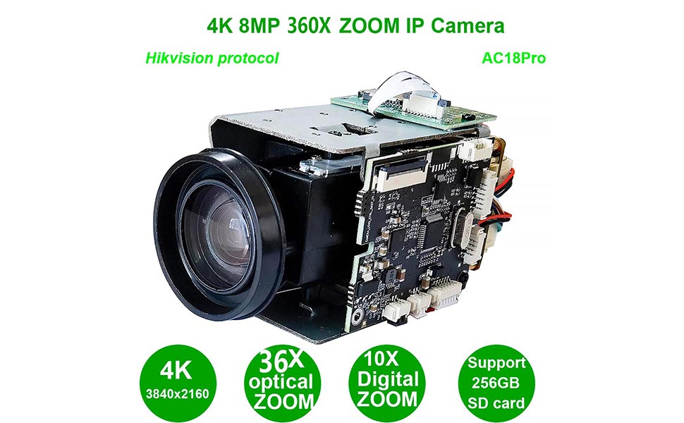 4K 8MP 360X zoom lens IP Camera adopts highly integrated MSTAR338Q+IMX415 processor, extremely low power consumption and strong stability; supports H.265 compression algorithm to ensure image quality while effectively reducing network bandwidth occupation; powerful network function,