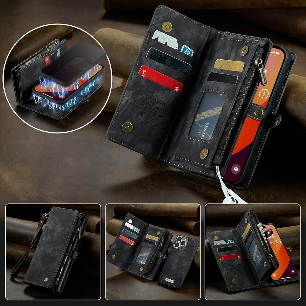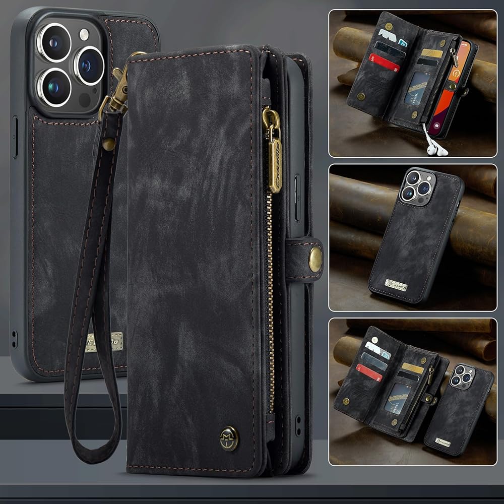 Kowauri Wallet Case for iPhone 15 Pro, Zipper Purse Folio Leather Wallet with Card Holder Wrist Strap Detachable Magnetic Shockproof Protective Back Case for iPhone 15 Pro (6.1 inch), Black