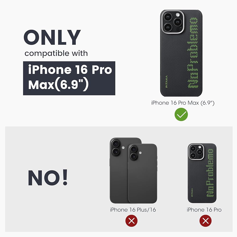 [First-ever Text Weaving with Aramid Fibers] Woven from aramid fiber, a strong yet light material commonly utilized in aerospace and military gear, the iPhone 16 Pro Max case provides exceptional strength, lightness, and resistance to scratch, corrosion, and discoloration. By redesigning weaving techniques, PITAKA breaks new ground by pioneering the first-ever text weaving with aramid fibers.