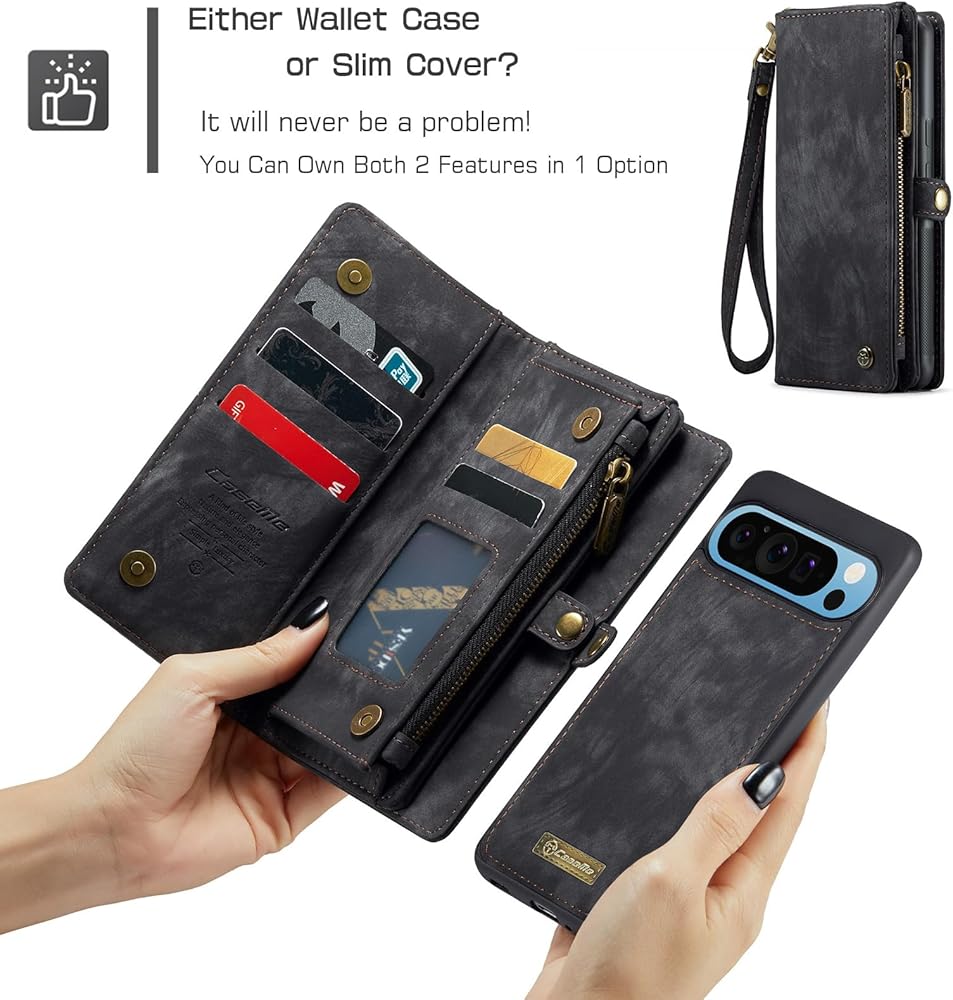 【Fashion Wallet 】Wallet Case for Google Pixel 9 Pro XL Design and phone case 2-in-1 Removeable Style, The Wallet with 8 card slot, 1 zipper closure coin pocket, 1 mobile phone cover, Luxury leather wallet case from Zipper closure ensures all your cards, money and personal staffs stay inside securely.