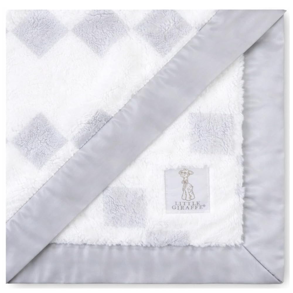 Our best-selling Luxe Baby Blanket is the softest, most luxurious baby blanket available. It's no surprise that it is adored by celebrities and trendsetters alike. A chic faux fur blanket with our signature satin border makes this a special gift for babies (and modern mamas)! They'll treasure this super soft baby blanket forever. All Little Giraffe baby necessities are made from the highest quality, softest textiles and provide comfort to soothe and calm baby for restful sleep. We search the world for the few fabrics that meet our high standards to ensure you've never felt anything softer! These super snuggly designer baby blankets are trimmed with a matching satin picture-frame edge. After one touch, you'll quickly understand why your child won't go anywhere without it, making them one of the essential new born must haves for your family. Little Giraffe unique collections have delighted style-makers and discerning parents with our signature blend of innovative design, minimalist graphic prints, a lush color palette suitable for both baby girls and baby boys and ultrasoft fabrics. Our soft blankets have a 100% poly microfiber fabric content. Poly microfiber is a very fine specific polyester thread with a suede finish, giving our products an exceptionally soft, luxurious hand feel. Little Giraffe baby items retain their elegant finish and heirloom quality even after years of use and care. Care instructions: Machine wash separately, on a cold, gentle cycle, without bleach; Hang or dry flat. Little Giraffe is known for creating top-of-the-line, luxury baby products and newborn essentials – must-haves. Since 2000, we have been renowned for our super-soft receiving blankets, baby towels, and have since become one of the preferred baby registry must-haves as well as one of the most popular baby shower gifts.