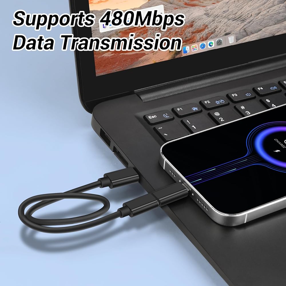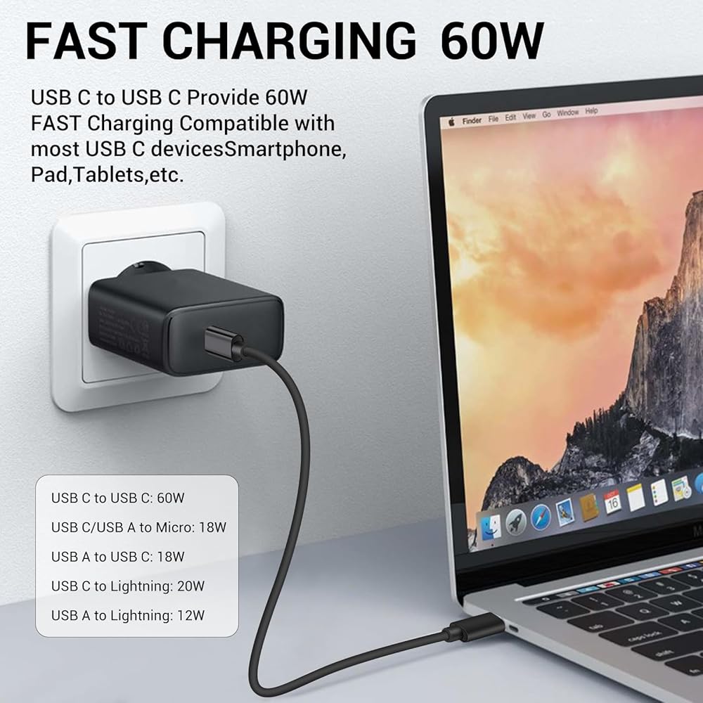 【Charging and Fast Data Transfer】 The usbc to usbc cable charging is supported up to 60W (20V 3A, If the charger adapter is supported), and the output current: Type C is 3A and light/micro is 2.4A MAX.