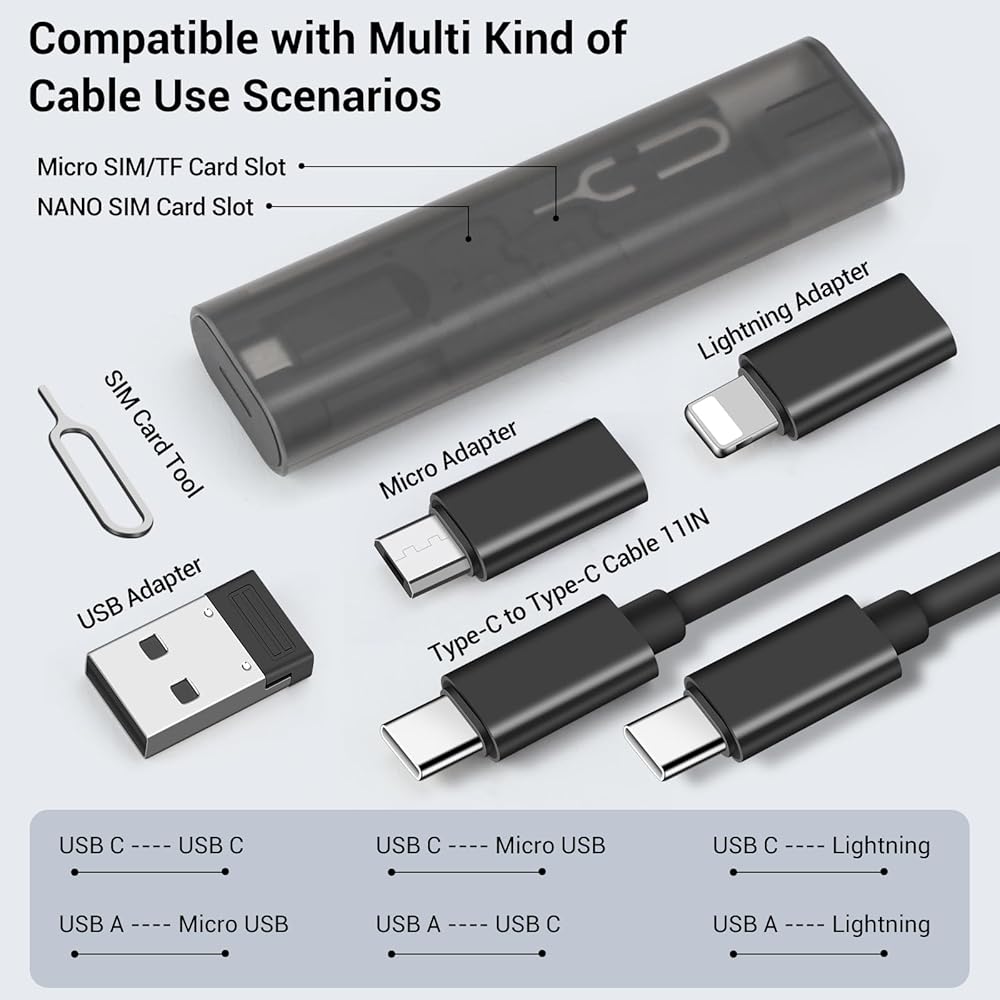 【One Cable Kit for All Combination】USB c to lightning cable includes: One 11" Type-C cable and 3 USB C data adapters(Type-A, Micro-USB, Lightning),1 Micro SIM TF card slots,1 NANO SIM card slots(SIM card is not included) and 1 SIM eject tool.