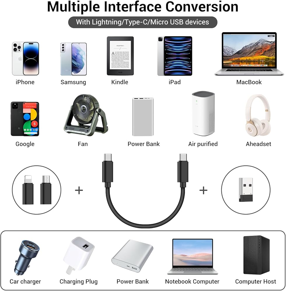 【Multi Compatible】Compact charging kit with multiple interfaces random conversion(USB A to Lighting, USB A to Type C, USB A to Micro, Type C to Type C,Type to Lighting,Type C to Micro),Meet the mutual conversion and charging transmission for Android/iOS devices.