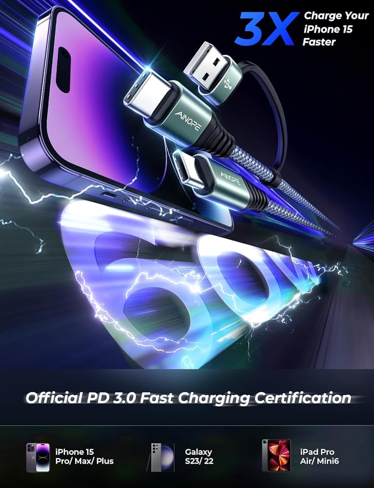 ⚡CERTIFIED 60W FAST CHARGING: The AINOPE USB c charger cable contains a built-in 56K ohm resistor and 60W maximum output to safeguard your device and charging adapter from harm. The maximum output current is 20V/3.1A (MAX), but you must use a power supply with the matching output of 18W/30W/45W/60W.Charge up to 80% in 30 minutes and transfer data up to 480Mbps (sync 1200 songs per minute).Enjoy your preferred charging usb to usbc cable for the Samsung Galaxy S23 Ultra