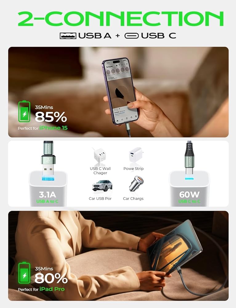 🏆3 MODES DESIGN & SWITCH: Type c charger(QC 3.1A)and USB C to USB C(PD Max 60W) 2 in 1. That means you have two USB C cables at the same time, USB A to C and USB C to USB C cable. Purchase one, double charging experience. NOTE: When charging MacBook/iPad pro/air devices, please use the USB C to USB C Cable