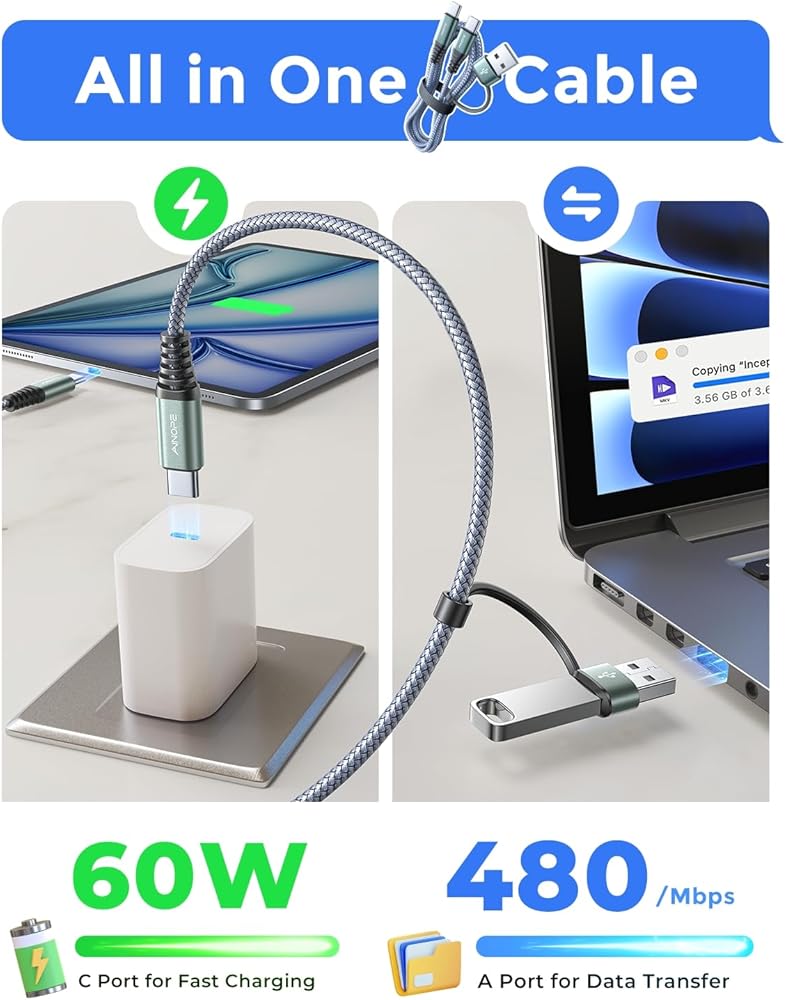 👍CONVERT ALL USB-A PORTS to USB-C: You never know where you will be and with access to what devices. So it is nice to have a 3-in-1 USB C cable that can go either way, straight in as a Type C or as a Type A with the attached converter. With the 2-in-1 cable, you can change the USB-A port to USB-C port. Compatible with all charger adapters that no matter it has a USB-C charging port or a USB-A port