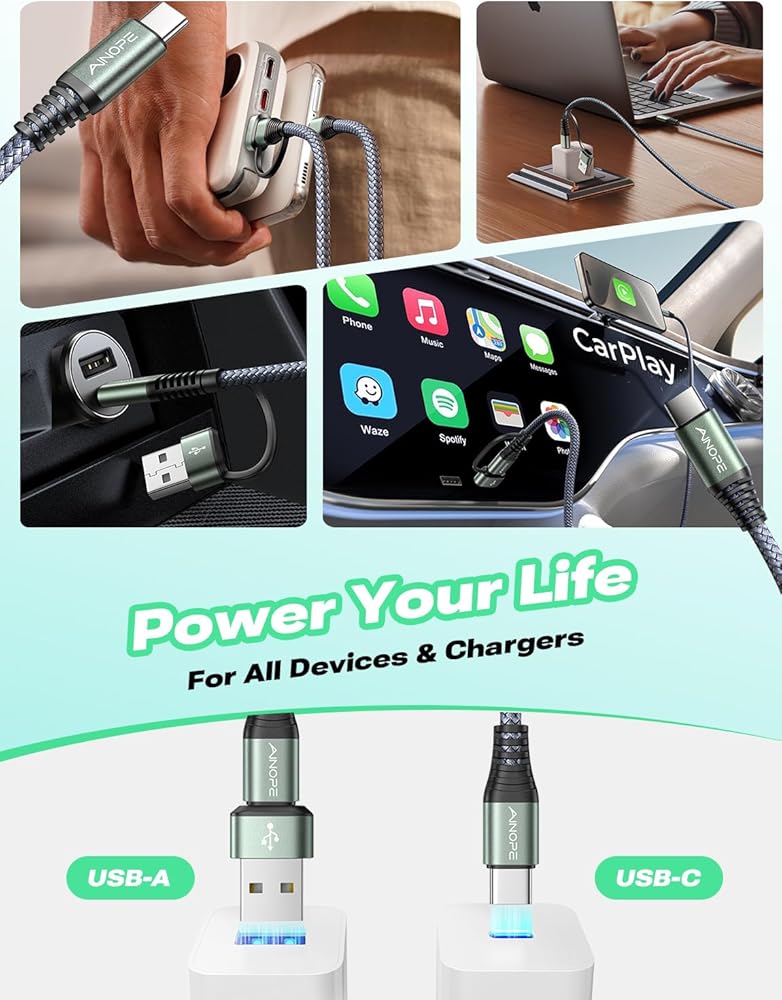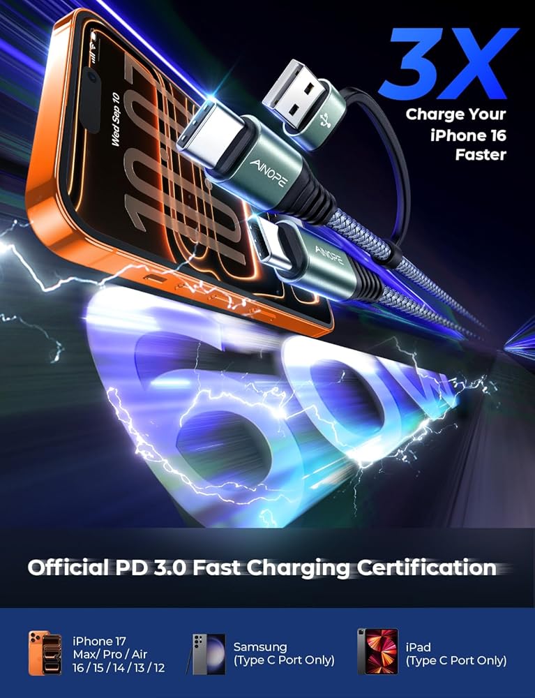 AINOPE 10FT USB C Cable Fast Charging with USB Adapter, Woven 60W USB to USB C Cable Type C Charger Fast Charging 10FT Long USB-C Cables for iPhone 17 Pro Max Air 16/15/14 Xbox X/S Wireless Controller