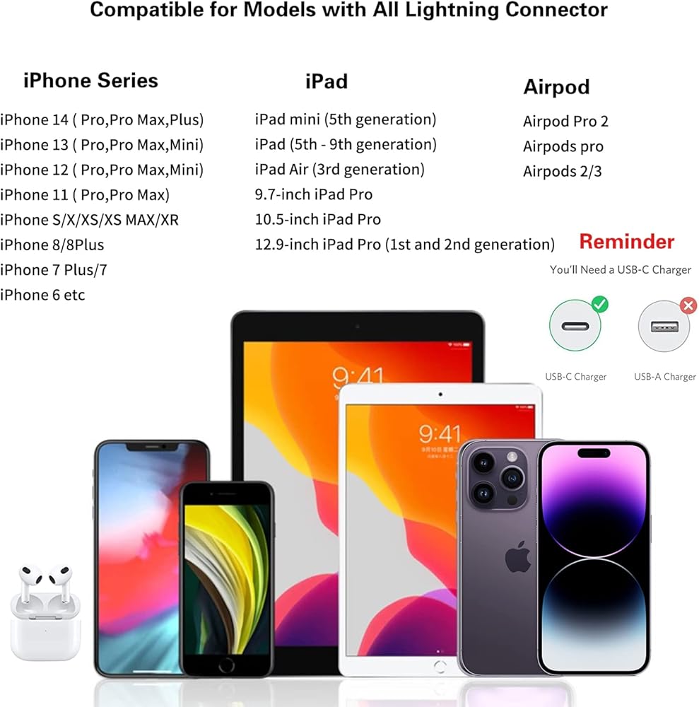Wide compatibility: This cable works with any Apple device that has a Lighting port, including iPhone 14/13/13 Pro/13 Pro Max/13 mini, iPhone 12/12 Pro/12 Pro Max/12 mini, iPad Pro 12.9-inch (5th generation)/11-inch (3rd generation), and more using the lighting charging devices.