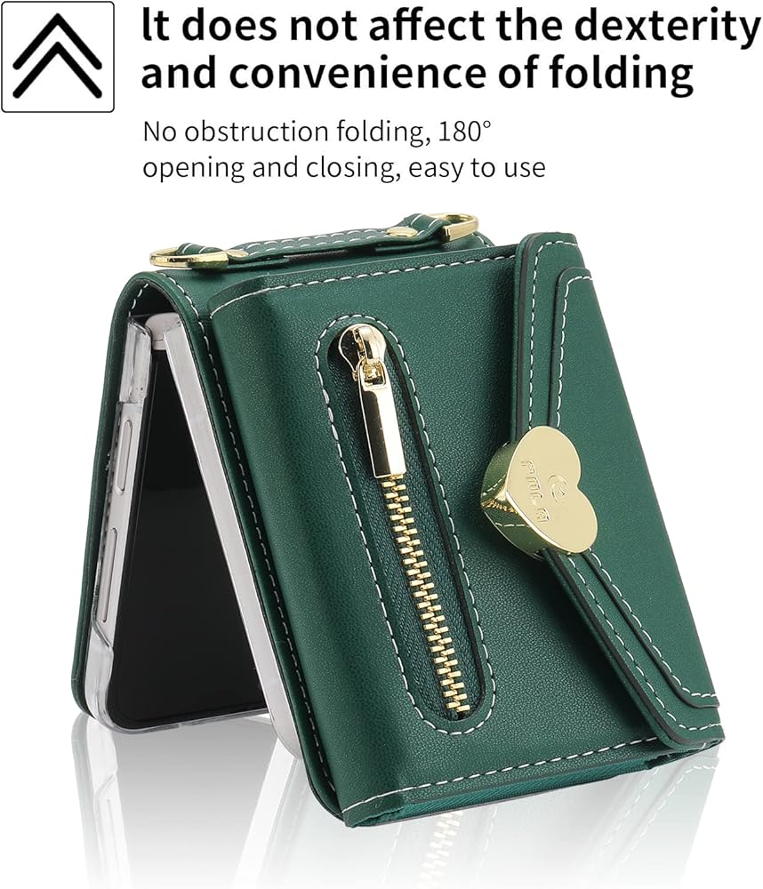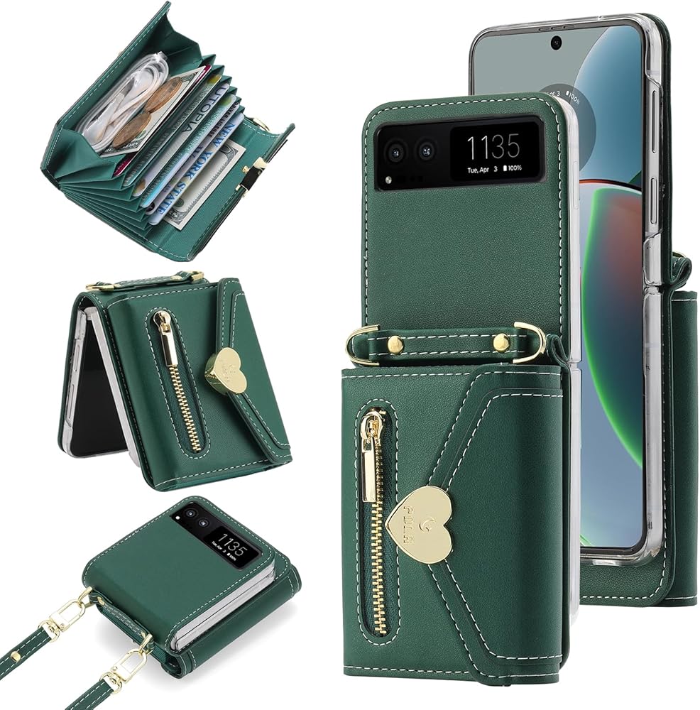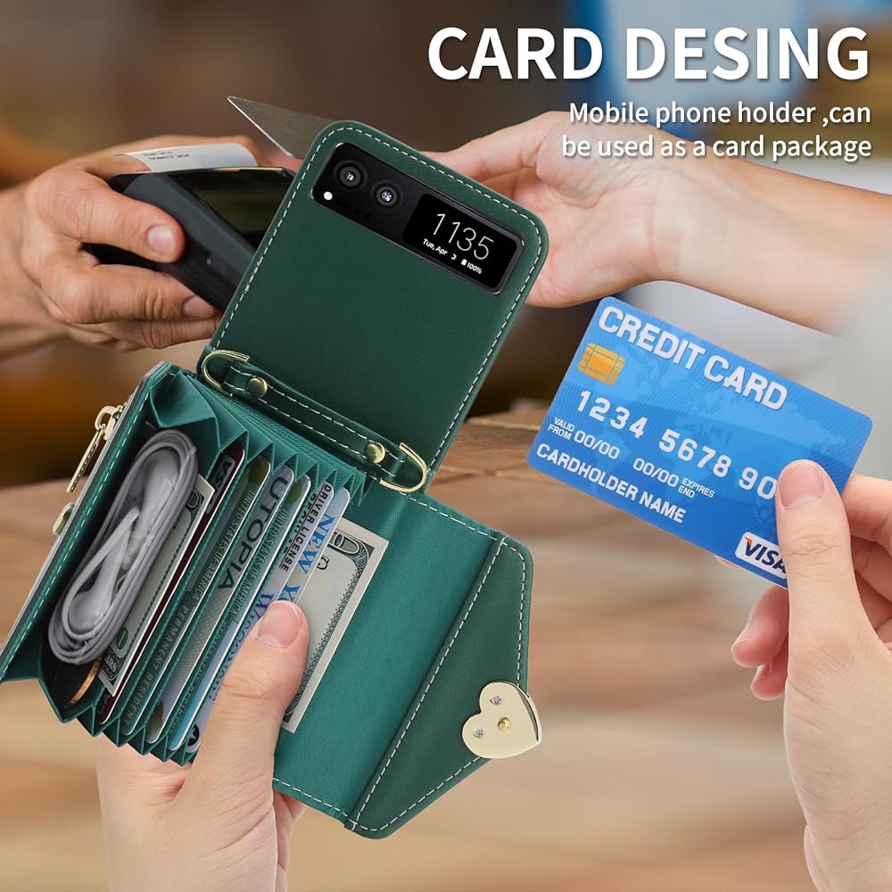 【Large Capacity Card Holder】 The Motorola Razr 2023 wallet case come with 4 Card Holders + 1 zipper wallet design, which allows you carrying up to 8 cards of IDs, debit cards, credit cards etc, making your everyday outings lighter and more convenient. No need to carry a heavy wallet when going out. Decorate with Heart Shaped Metal Buckle, safe and beautiful, and ensures these cards in a safe environment.