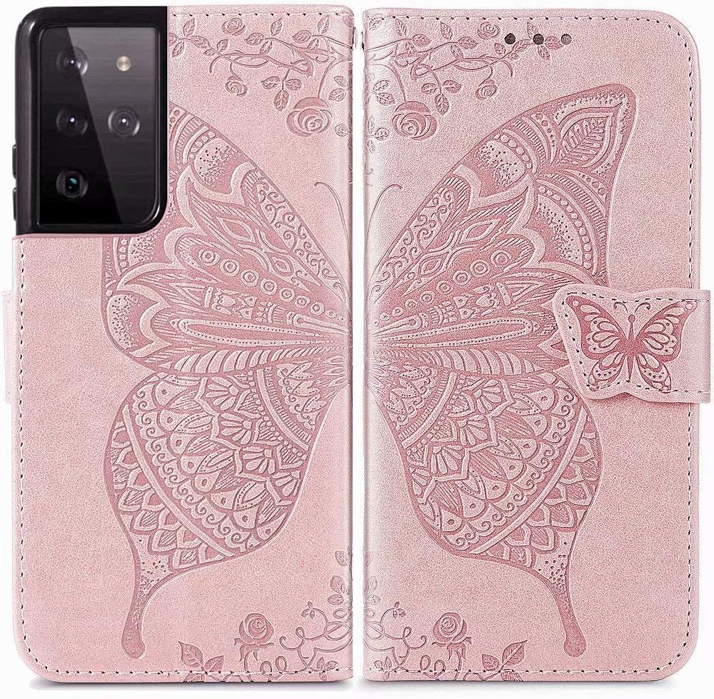 MEUPZZK Wallet Case for Samsung Galaxy S21 Ultra, Embossed Butterfly Flower Premium PU Leather [Folio Flip][Kickstand][Card Slots][Wrist Strap][6.8 inch] Cover for Samsung S21 Ultra (A-Rose)