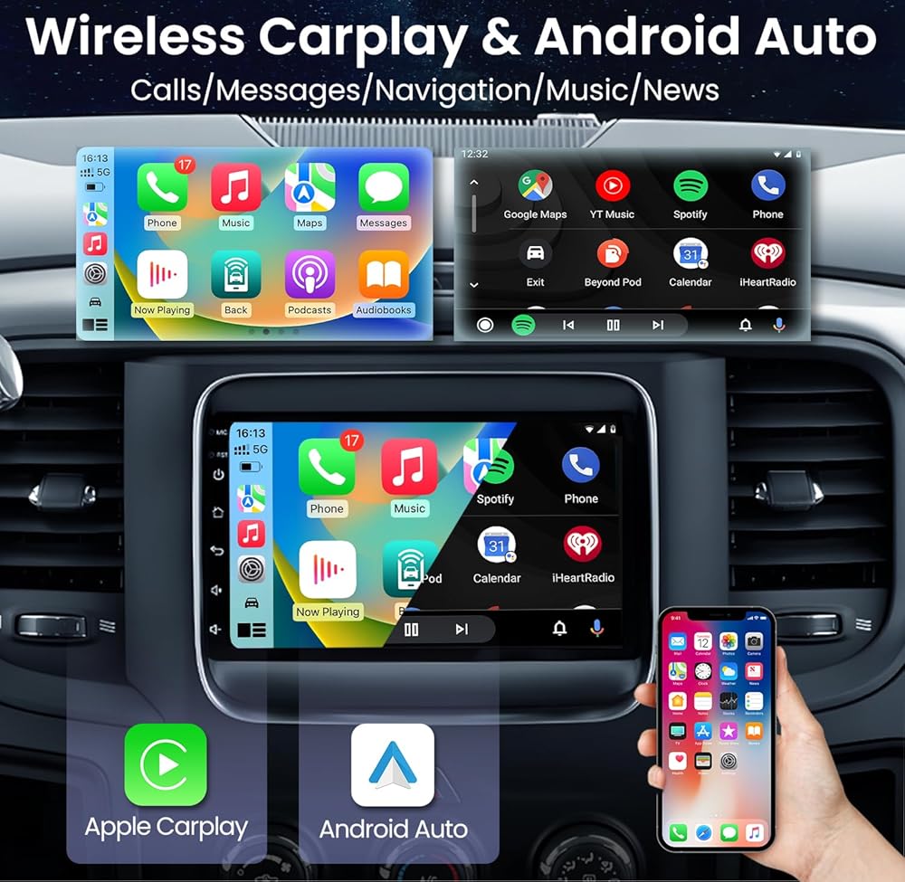 Carplay & Android Auto & MirrorLink : Wireless Apple CarPlay & Android Auto offer a Smart connectivity for your phone and Ram multimedia system. 2017 Ram 1500 radio supports Siri/Google controls. Additionally, head unit supports IOS/Android mirror link, allowing you to mirror your phone's screen on the radio's display and use your phone's apps, music, videos, and more