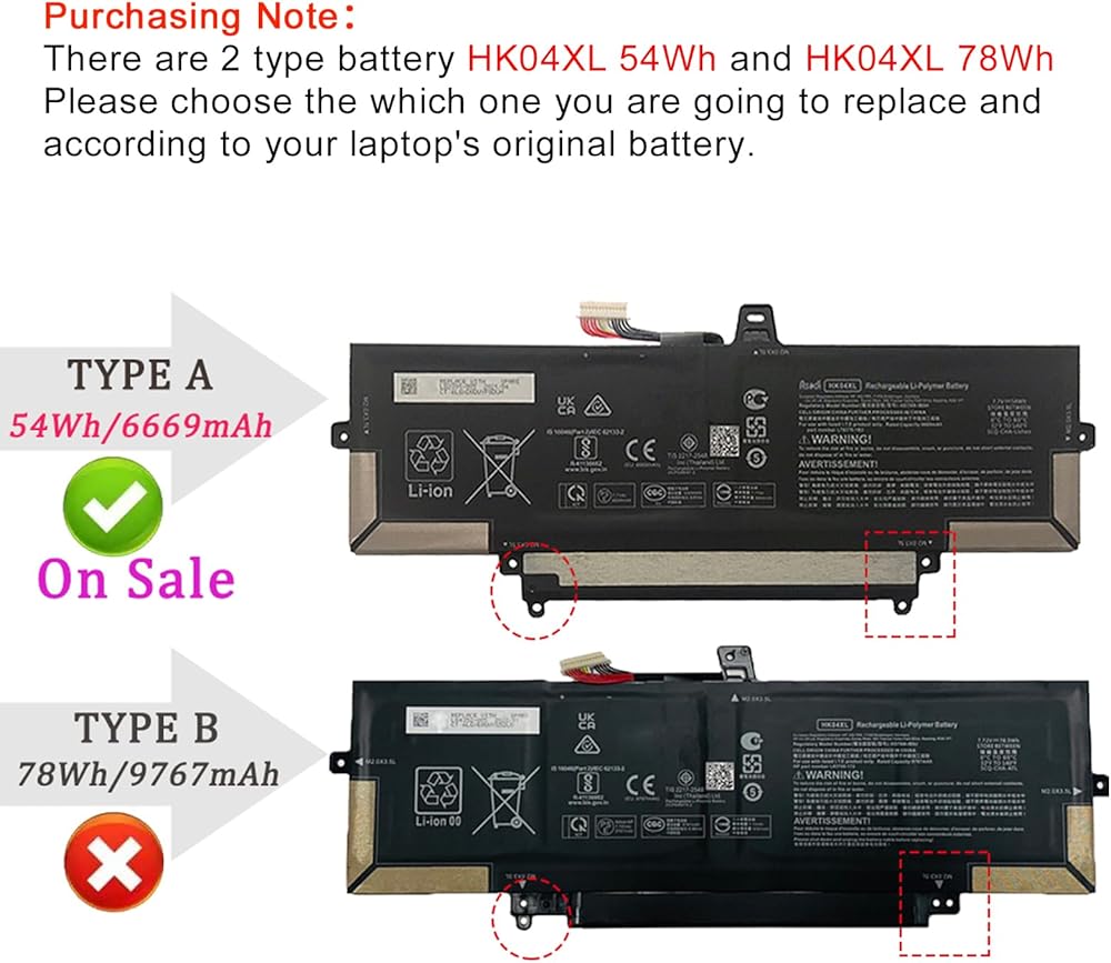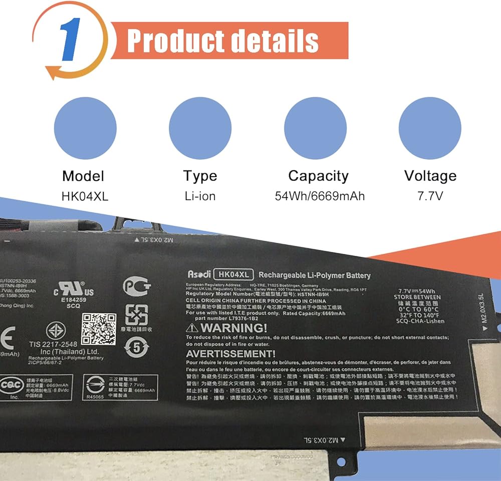 <1>Model: HK04XL . Voltage: 7.7V . Capacity: 54Wh/6669mAh . Color: Black . 100% brand new. (Please open the back case of your laptop and check out the exact part number of your laptop's original battery Before placing your order)