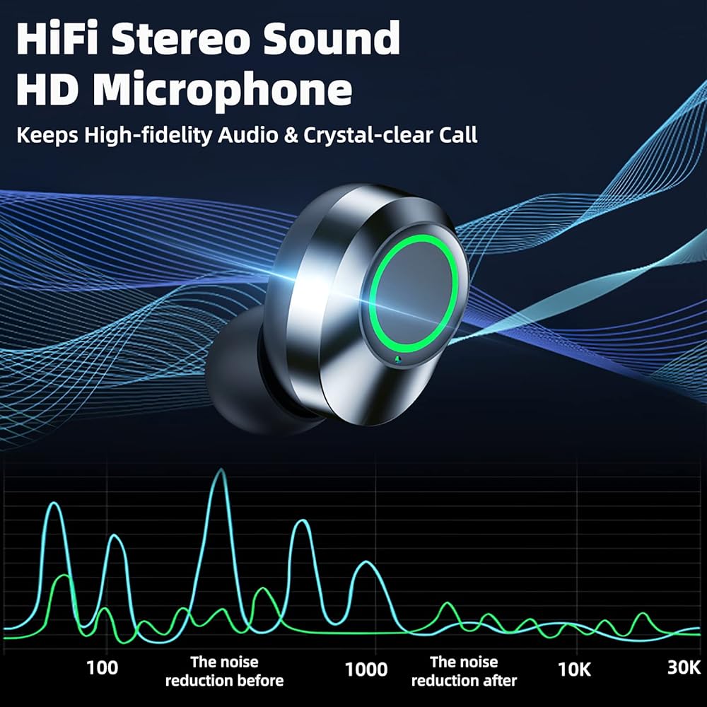 HiFi Stereo Sound Quality - The Bluetooth earbuds come with a 13mm vibrating diaphragm and HD rendering technology that produces incredible sound quality and crystal-clear highs. These cordless TWS in-ear earbuds are well balanced with bass and clear treble to create a rich high-fidelity sound experience. Built in Mic Headset Premium Sound with Deep Bass for Running Sport.