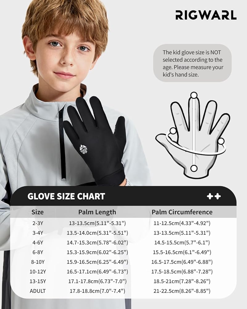 VERSITILE KIDS WINTER GLOVES: RIGWARL kids climbing gloves are perfect for kids outdoor activities, running, hiking and school in spring or fall. Ideal gifts for toddler boys girls aged 2t 3t 4t 5t 6 7 8 9 10 years old. Grab a pair and enjoy winter fun