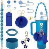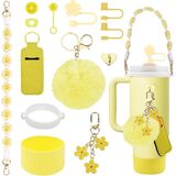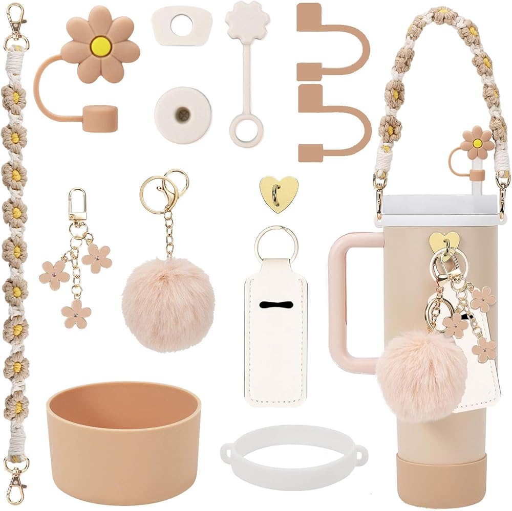 The set includes -1pcs water bottle handle strap, 1pcs water bottle boot, 1pcs silicone straw cover, 1pcs pompom ball, 1pcs daisy key-chain, 1pcs heart hook. The product does not include cups